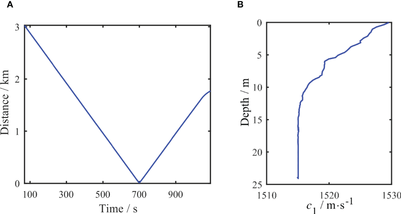 Before the start of the experiment, the line connecting the two ships was the x-coordinate, and the positive direction of the receiving ship was the y-coordinate. In this coordinate system, Figure 11A shows the distance between the source ship and receiving ship with time during the experiment. Figure 11B shows the relationship between the sound speed profile and the sea depth in the experimental area.