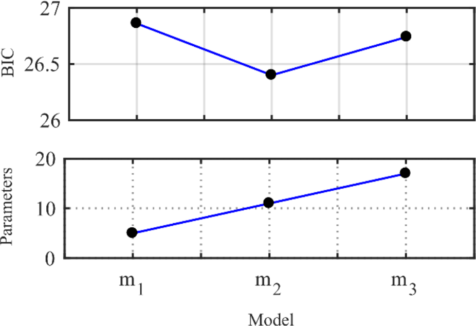 Model selection was performed by evaluating different layered models using BIC to determine the simplest parameterization that matches the measured data, and the results are shown in Figure 5. The BIC values of the three inversion models with different hierarchical structures are 36.52, 34.24, and 36.93, respectively. Based on the BIC, the 2-layer model was selected as the best-parameterized model, and the selected result agreed with the specification in Table 1.