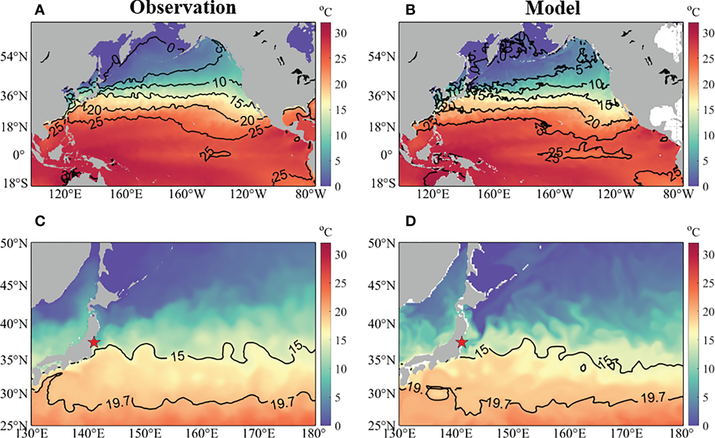 Comparison of the monthly mean sea surface temperature between (A, C) OSTIA and (B, D) model results in the (A, B) North Pacific and (C, D) western North Pacific in February 2012. The red star represents the FDNPP location.
