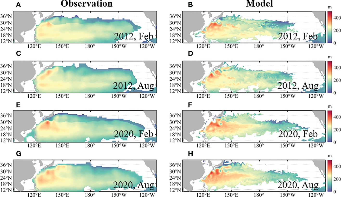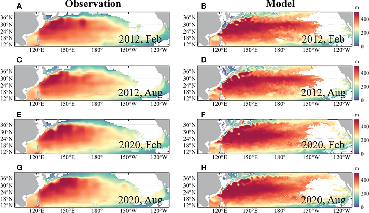 Comparison of the mid-depth of STMW between (A, C, E, G) EN4 and (B, D, F, H) model results in (A, B) February 2012, (C, D) August 2012, (E, F) February 2020, and (G, H) August 2020. STMW was defined by a temperature of 15.4–19.7 °C and salinity of 34.6–35.0 g/kg.