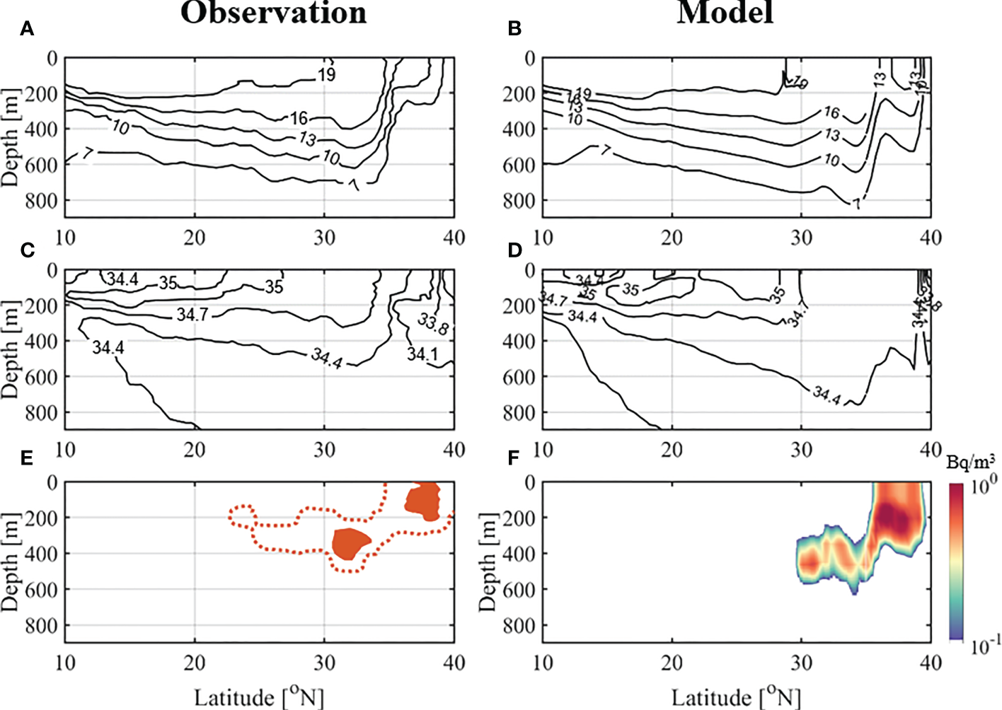 Vertical section of (A, B) temperature, (C, D) salinity, and (E, F)134Cs in observation (Kumamoto et al., 2014) and model along line L1(149°E). The background contour units are (A, B) the water temperature (°C) and (C, D) the salinity (g/kg). The orange dashed lines denote 2 Bq/m3; orange shadow in the observation denotes ≥10 Bq/m3. (E) is redraw from Kumamoto et al. 2014, (Figure 3A).