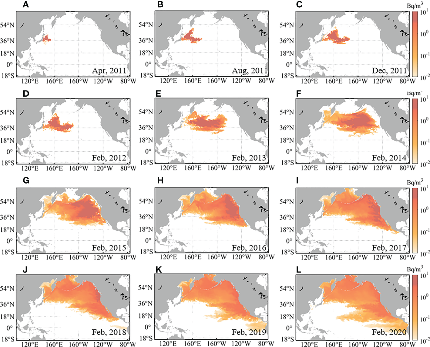 Monthly horizontal distribution of surface 137Cs concentration from the model results in April (A–C), August and December 2011 and each February (D–L) from 2012 to 2020. 137Cs concentration was corrected for radioactive decay (30 years).