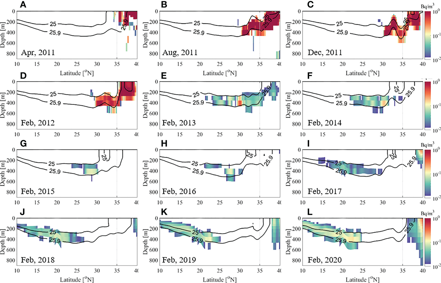 Monthly vertical section of 137Cs concentration along line L1 (149°E) in April (A–C), August and December 2011 and each February (D–L) from 2012 to 2020. The background contour represents the potential density (kg/m3). 137Cs concentration was corrected for radioactive decay (30 years).