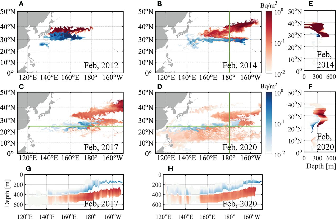 Monthly horizontal 137Cs concentration on the density layer of 25.4 kg/m3 (blue) and 26.3 kg/m3 (red) corresponding to STMW and CMW, respectively, in February (A) 2012, (B) 2014, (C) 2017, and (D) 2020. Monthly vertical 137Cs concentration along the meridional line (green line in (B) and (D)) at 180° in February (E) 2014 and (F) 2020. Monthly vertical 137Cs concentration along the zonal line (green line in (C) and (D)) at 25°N in February (G) 2017 and (H) 2020. 137Cs concentration was corrected for radioactive decay (30 years).