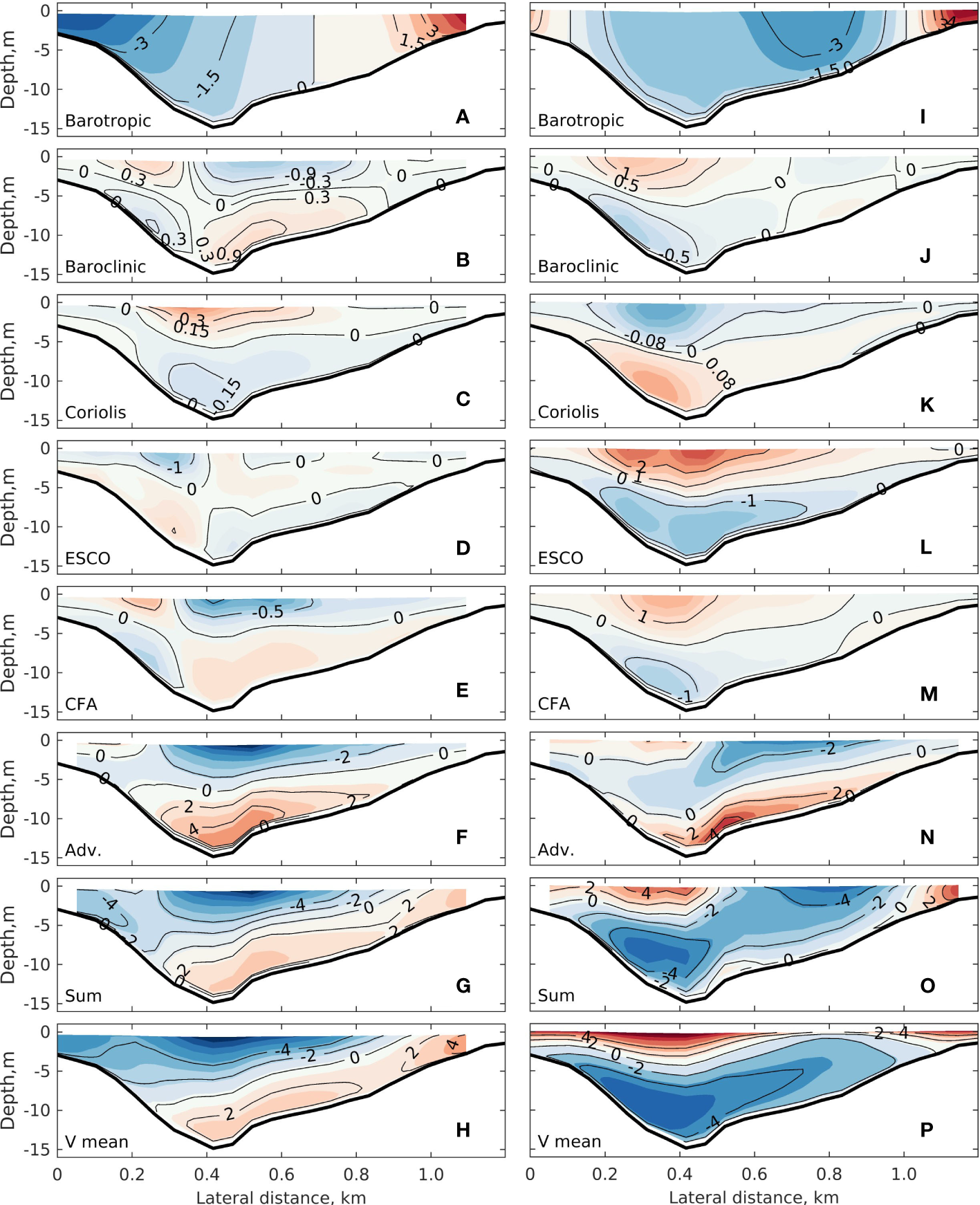 Figure 7 Transverse distributions of the across-channel residual flow due to individual terms of the subtidal lateral momentum balance during (left column) neap tide and (right column) spring tide: (A, I) barotropic flow (vBaro), (B, J) baroclinic (density-driven) flow (vD), (C, K) flow due to Coriolis deflection (vC), (D, L) ESCO induced flow (vESCO), (E, M) CFA induced flow,VCFA and (F, N) nonlinear advection (vADV). Panels (G, O) are the summation of the above terms. Panels (H, P) show the tidal mean velocity. Positive values indicate rightward flow. The unit in all contours is cm s−1.