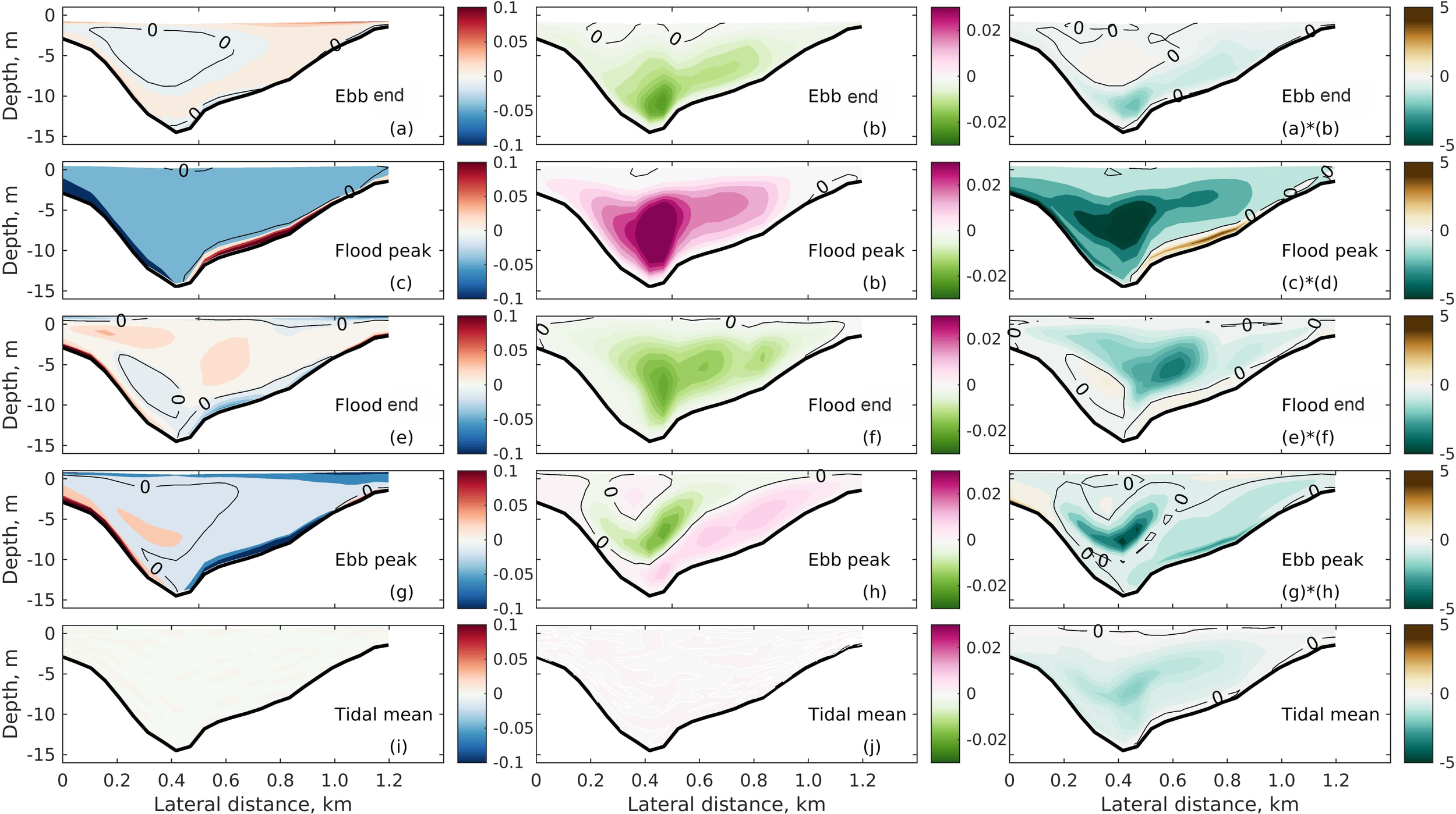 Figure 4 Transverse distributions (looking seaward) of the currents in along-channel (contours, the green colors are flowing toward the viewer) and cross-channel (arrows) directions at different phases of the neap (left column) and spring (right column) tides. The first to the fourth rows show the end of ebb (the cross-sectional mean of the along-channel ebb flow is zero) (A, F), the flood peak (the cross-sectional mean of the along-channel flood flow is the maximum) (B, G), the end of flood (cross-sectional mean along-channel flood flow is zero) (C, H) and the ebb peak (cross-sectional mean along-channel ebb flow is maximum). (D, I) The fifth row shows the tidal mean. (E, J) Thick dashed curves indicate the 0 m s−1 contours.
