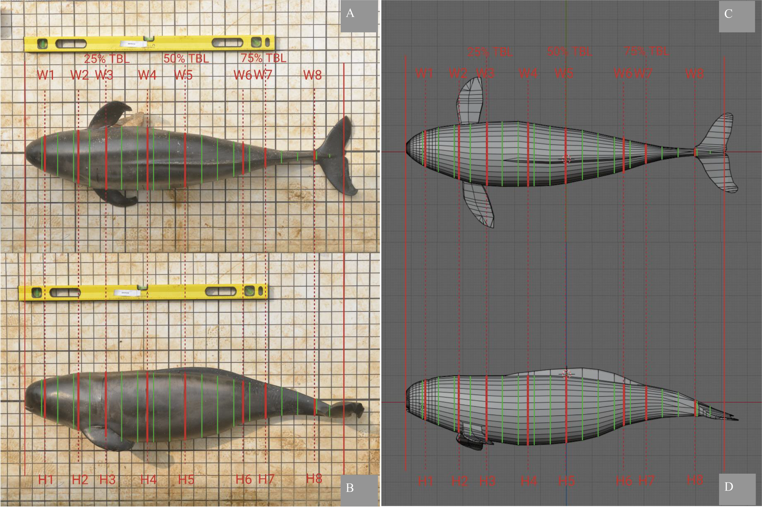The photogrammetry and 3D models. (A) Dorsal view of an EAFP, showing the width (W) measurements at eight sites (W1 to W8, thick red line) and at the sites of 5% TBL increment (thin green line). (B) Left lateral view of the same EAFP, showing the corresponding height H measurement at eight sites (H1 to H8, thick red line) and at the sites of 5% TBL increment (thin green line). Note that sites of H3 (or W3), H5 (or W5), and H7 (or W7) equate sites of 25% TBL, 50% TBL, and 75% TBL respectively. (C, D) the 3D model of the same EAFP, showing the dorsal (C) and left lateral (D) views respectively. The pectoral fins and fluke were excluded when estimating the TBV.
