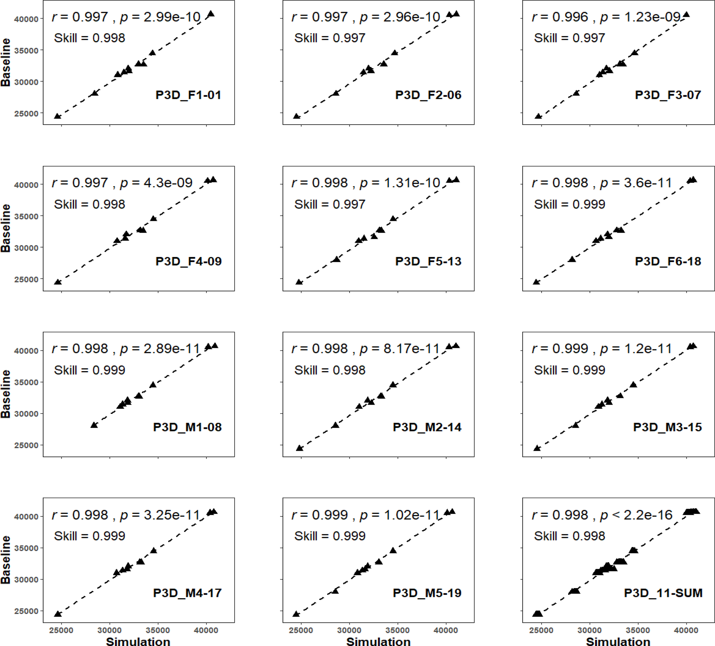 The fitness of the eleven delegate P3Ds against the baseline model was tested with the Pearson correlation coefficient and the r-value, p-value, and skill value (index of agreement) were reported as the quantitative evaluation of each delegate P3D (Figure 4). The significance level and the confidence interval for all tests was set at 0.01 and 95% respectively. The statistical analyses were conducted exclusively in the open-source software of RStudio (RRID: SCR_000432, R version 4.2.1) (R Core Team, 2020).
