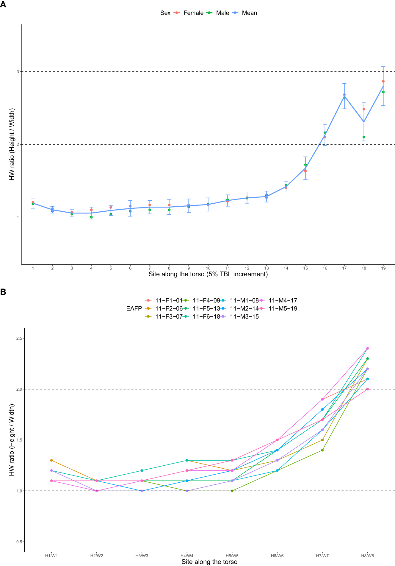 (A) Mean height/width (HW) ratios at sites of each 5%TBL increment (1-19). (B) HW ratios at eight sites from H1/W1 to H8/W8. Note the H3/W3, H5/W5, and H7/W7 equate sites of 25% TBL, 50% TBL, and 75% TBL respectively.