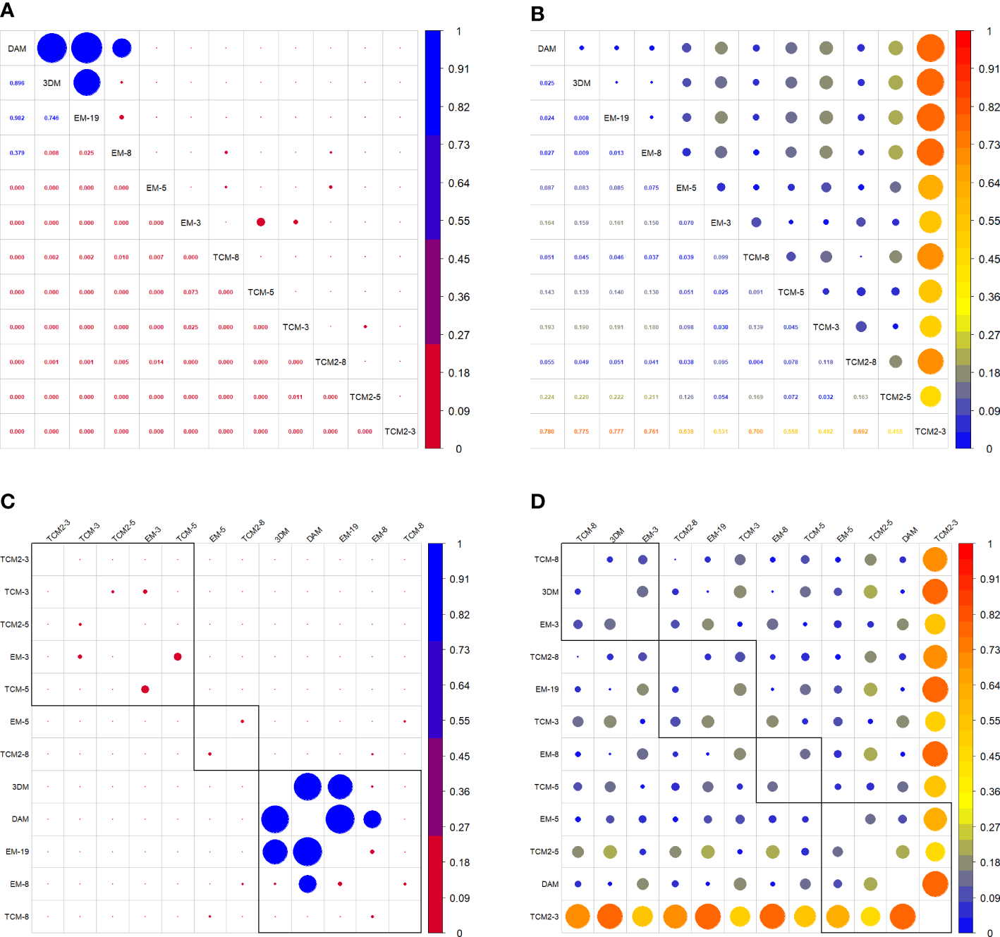 (A) Correlation matrix of p values of each two comparisons. (C) Grouping functions on correlated p values. (B) Correlation matrix of MAPE values of each two comparisons. (D) Grouping functions on correlated MAPE values.