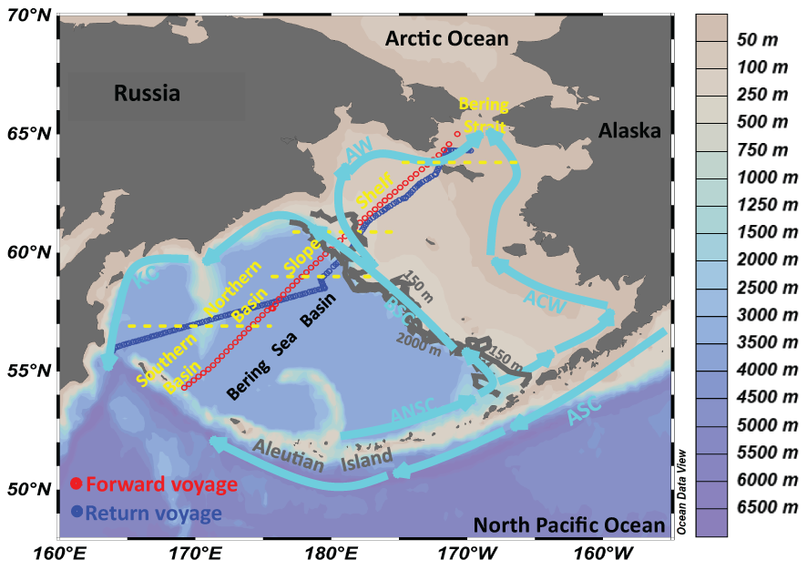 Geographic settings in the Bering Sea. Light blue arrows denote the current, modified from Detlef et al. (2020); Fransson et al. (2006), and Song et al. (2016). Also shown are the underway measurements during the forward voyage in July (red circles) and the return voyage in September (blue circles). KC, Kamchatka Current; ANSC, Aleutian North Slope Current; BSC, Bering Slope Current; ASC, Alaskan Stream Current; ACW, Alaskan Coastal Water; AW, Anadyr Water