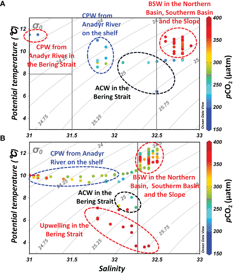 Relationships between potential temperature (θ, °C) and salinity (T-S diagram) in the Bering Sea during July (A) and September (B). Also shown are the water masses of the Coastal Plume Water from the Anadyr River (CPW, T>8 °C, S<31.5) in July and September, the Alaskan Coastal Water (ACW, T>3 °C, 31.5<S<32.5), and the Bering Summer Water (BSW, T>3 °C, 32.5<S) during both months (Itoh et al., 2015; Song et al., 2016; Wang et al., 2022), and the upwelling in September. Note that the temperature and salinity boundaries are not precise.