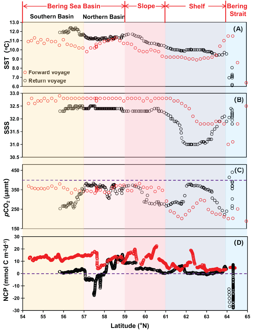 Latitudinal distribution of (A) temperature, SST (°C), (B) salinity, SSS, (C) partial pressure of CO2, pCO2 (µatm), and (D) net community production, NCP (mmol C m-2d-1) during the forward voyage in July (red circles) and the return voyage in September (black circles). The blue dashed line in (C) indicates the average atmospheric pCO2 level of 395 μatm during the cruise; in (D), it indicates the NCP of 0 mmol C m-2d-1. Regions from 54°N to 57°N (the Southern Basin) and from 57°N to 59°N (the Northern Basin) are merged as the Bering Sea Basin.