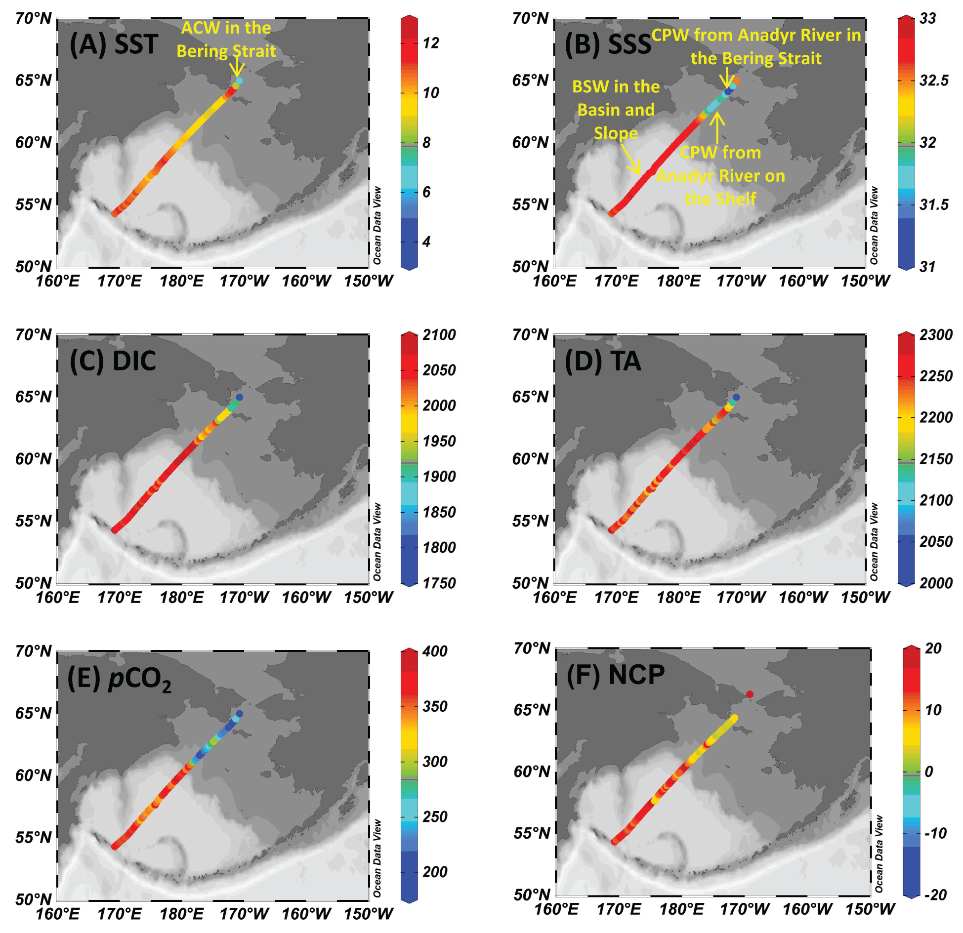 As shown in sections 3.1 and 3.2, the dynamics of the carbonate system during both voyages were largely controlled by the mixing of different water masses, including BSW in the Southern Basin, the Northern Basin, and the Slope and the CPW, ACW, and the coastal upwelling in the western Bering Strait. We then adopted a DIC-TA diagram (Figure 6) to distinguish different processes (e.g., physical mixing and biological activities) affecting the carbonate system.