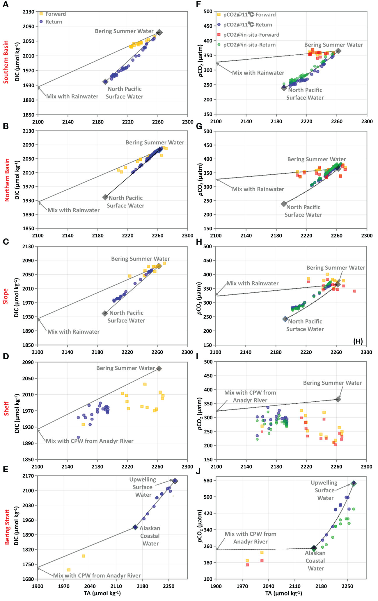 DIC-TA (left column) and pCO2-TA (right column) relationships in the Southern Basin (A, F), the Northern Basin (B, G), the Slope (C, H), the Shelf (D, I), and the Bering Strait (E, J) during both voyages. In all panels, gray diamonds are end-members, and their values are summarized in Table 2. Solid lines represent the hypothetical conservative mixing lines between different end-members. pCO2@11°C represents pCO2 normalized to 11 °C, following Wanninkhof et al. (2022), and 11 °C is the average SST in the Bering Sea Basin during both voyages.