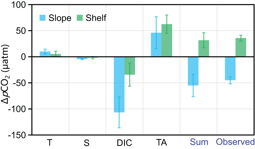 where dVpCO2 is the change in pCO2. ∂VpCO2/∂T, ∂VpCO2/∂S, ∂VpCO2/∂DIC, and ∂VpCO2/∂TA are the partial derivatives of different parameters, which were estimated based on the observed data, assuming a 1‰ change (e.g., increase) on the relative parameters while keeping the other parameters constant (following Orr et al., 2015). Taking the estimation of ∂VpCO2/∂TA, for example, the initial pCO2,t=0=f(T0, S0, DIC0, TA0) from CO2SYS stimulation, the changed pCO2,t=1= f(T0, S0, DIC0, TA1), where TA1 = 1.001×TA0; thus, ∂VpCO2/∂TA=(pCO21-pCO20)/(TA1-TA0).