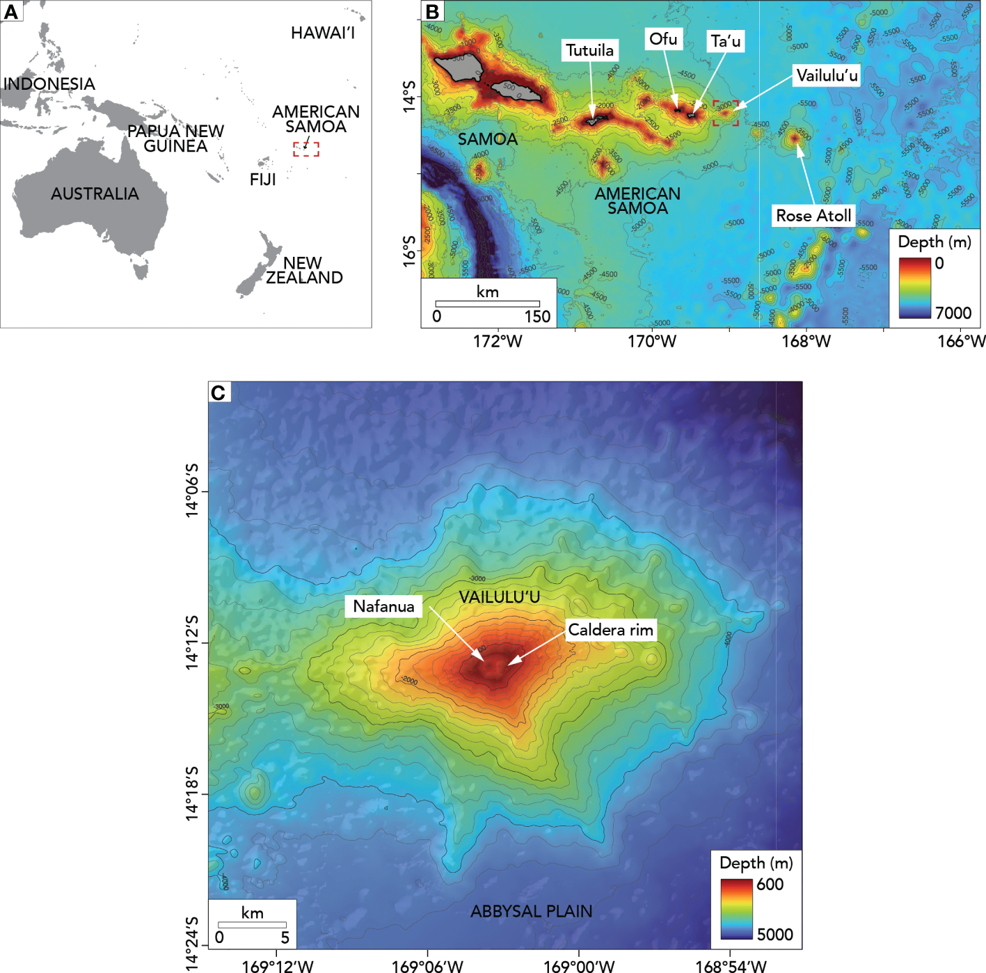 Maps of the study area. (A) Location of American Samoa in the Central Pacific. The red dotted box indicates the location of the Samoan region. (B) Vailulu’u seamount in the bathymetric context of the Samoan region (including the Independent State of Samoa and American Samoa). The red dotted box indicates the location of Vailulu’u seamount. (C) Bathymetry and main features of Vailulu’u. The gray lines in (B, C) show 500m and 200m depth contours, respectively.