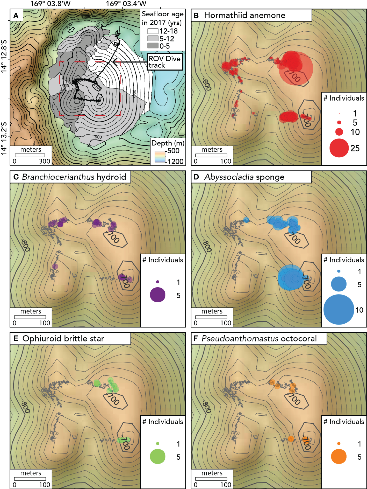 Maps showing the seafloor age and the distribution of benthic animal observations on Nafanua cone in Vailulu’u caldera in 2017. (A) Seafloor age ranges based on the depth changes between multibeam surveys, with the track of ROV D2 dive 9 of the expedition EX1702 overlain. Age ranges are indicated with gray areas. The black depth contours are separated by 20m. The seafloor age areas on Nafanua in this figure are the same as the areas outlined in bold in Figures 1F, G, and H, and The red dotted box indicates the location of the area where ROV benthic surveys were conducted and defines the extent of the maps shown in Figures 3B–F. (B) Hormathiid anemone observations. (C)Branchiocerianthus hydroid observations. (D)Abyssocladia sponge. (E) Ophiuroid brittle star. (F)Pseudoanthomastus octocoral. Individual animal observations within 1 meter of each other were binned together using the Point Cluster symbology (QGIS). The points’ radius is proportional to the number of observations in each 1-meter bin. The gray ‘fuzzy’ lines indicate the D2 ROV track when the vehicle was within 5 meters of the seafloor. The black depth contours are separated by 10m.