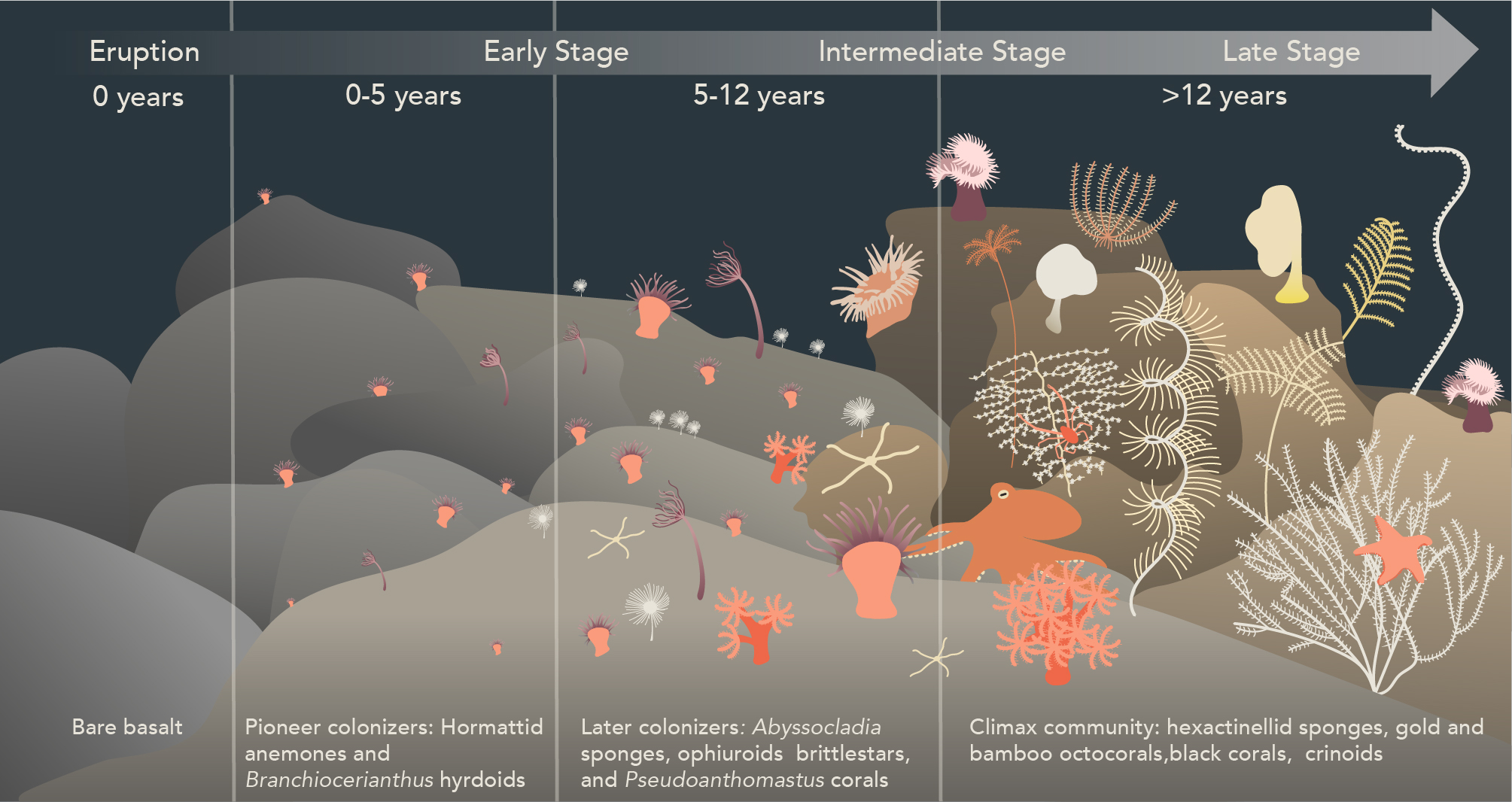 Few studies have examined primary succession dynamics on new deep seafloor away from hydrothermal vents. Putts and colleagues (2019) found that deep-sea coral communities, 400 to 450 meters below sea level (mbsl) off the volcanic island of Hawai’i, show evidence of successional dynamics. Coral species diversity, abundance, and size increase as a function of the age of the seafloor they inhabit. Their study suggests that the time scales of succession in these communities span decades to millennia (the ages of the studied lava flows ranged from 61 to ~15,000 years). Milligan and Tunnicliffe (1994) found that young seafloor, 2- 6 years old, on the Cleft segment of the Juan de Fuca Ridge spreading center was scarcely colonized by sessile non-vent species. Species diversity and abundance were higher on older seafloor (> 6 years old). However, primary succession dynamics of deep seamount communities remain unknown on year-to-decade time scales, limiting our understanding of the incipient stages of colonization and development of non-vent benthic communities.