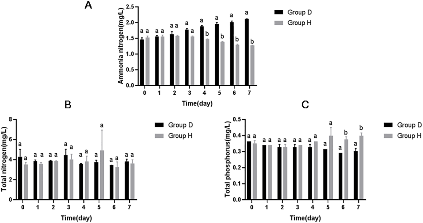As shown in Figure 1, with the extension of treatment time, the concentration of ammonia nitrogen in the water body of Group H decreased significantly with the extension of treatment time, which was significantly lower than that of Group D from the fourth day of treatment (P<0.05). 7 days later, compared to initial concentration, the concentration of ammonia nitrogen in Group D (Control) increased by 45.21%, but the concentration of ammonia nitrogen in Group H decreased by 16.33%. And in Day 7, the concentration of ammonia nitrogen in Group D was 1.66 times as that of Group H. However, there was no significant difference in total nitrogen content and total phosphorus content between Group D and Group H (P>0.05).