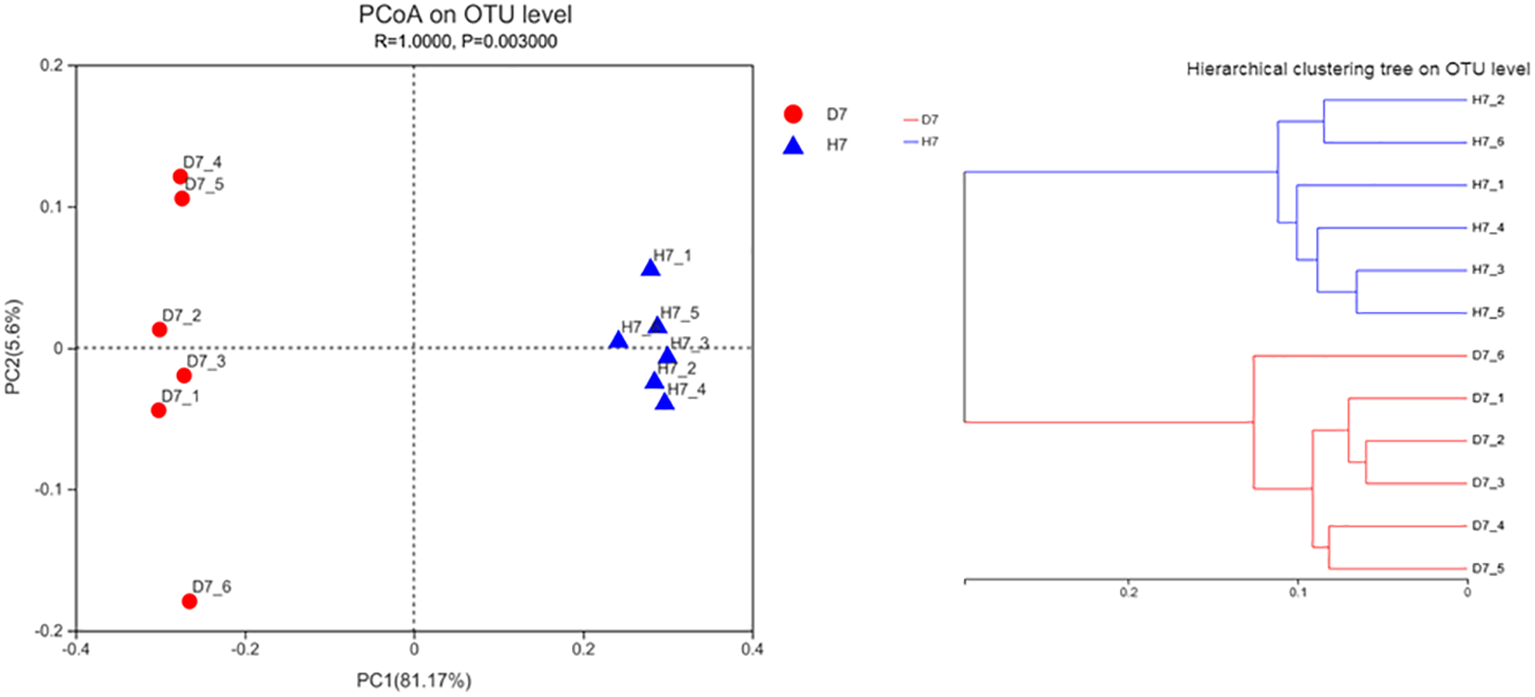 Figure 2 , which showed that Group D (Control) and Group H were obviously separated. PCoA analysis demonstrated substantial differences between Group D (Control) and Group H, indicating that hydrogen had significant effects on the autochthonous microbiota compared to the control.