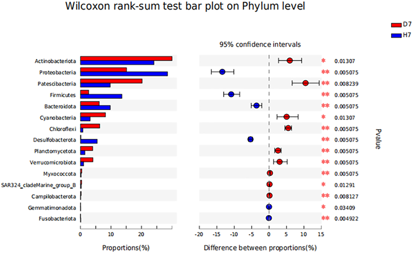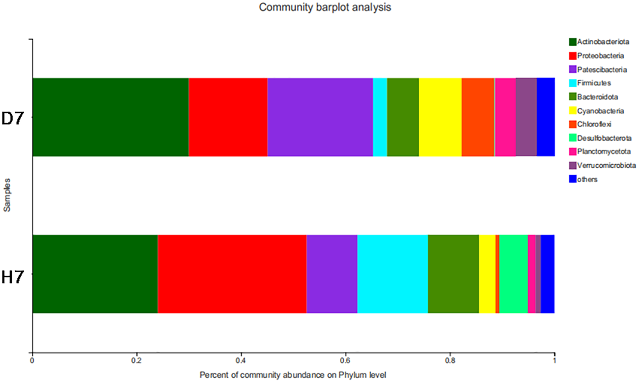 From Figure 3, we can know that after 7-days’ treatment, Group D and Group H has different pattern of microbial community composition. Compared with Group D, the abundance of Actinobaciota, Patescibacteria, Cyanobacteria, Chloroflexi, Planctomycota, Verrucomicrobiota decreased in Group H, while the abundance of Proteobacter, Firmicutes, Bacteroidota, Desulfobacter increased. As explained in Figure 4, on the phyla level, the abundance of Proteobacteria, Firmicutes, Bacteroides and Desulfurized bacteria in Group H was significantly higher than that in Group D (P <0.05), while the abundance of Actinomycetes, Patella bacteria, Cyanobacteria, Planctomycota and Verrucomicrobia in Group H was significantly lower than that in Group D (P<0.05).