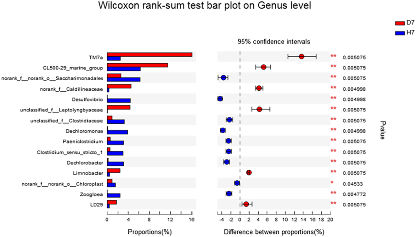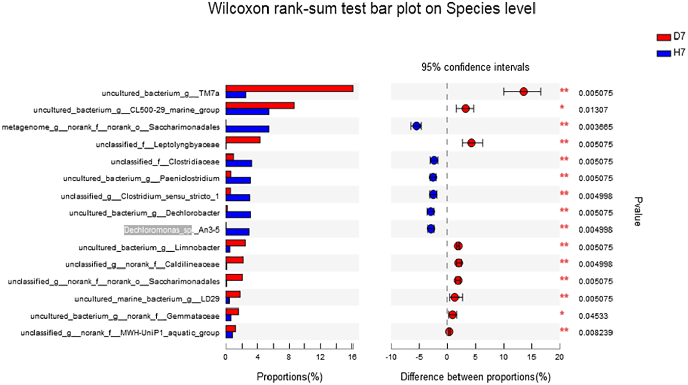 The genus level as shown in Figure 5, the abundance of norank_f:norank_o:Saccharimonadales, Desulfovibrio, Dechromonas, Paeniclostridium, Clostridium_sensu_stricto_1, Dechromobacter in Group H was significantly higher than that of Group D (P <0.05), and the abundance of TM7a, CL500-29_marine_group was significantly lower than that of Group D (P <0.05). The species level as shown in Figure 6, the abundance of Dechloromonas_sp._An3-5 and norank_o_Saccharimonadales in Group H was significantly higher than that of Group D (P <0.05).