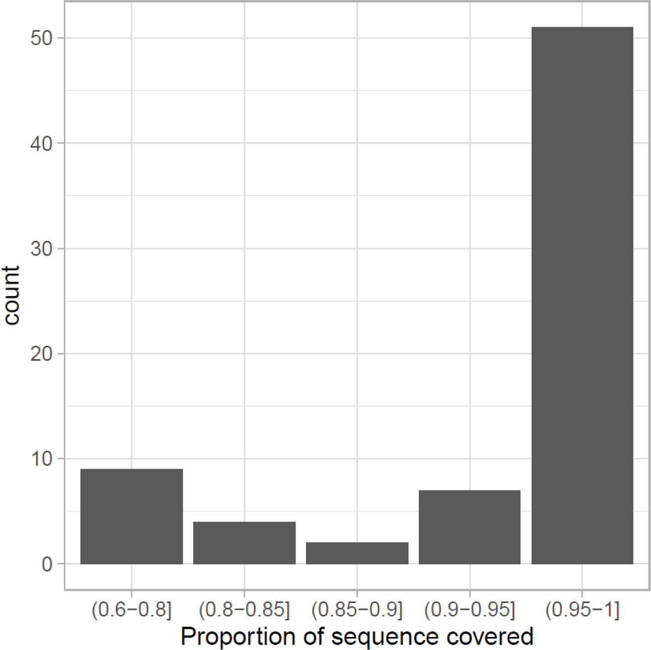 From the list of candidate genes not only the majority (68 out of 109) of them can be found in this assembly, but also the predicted sequence can be considered as full-length (Figure 2), taking as reference the protein sequence of G. morhua or Danio rerio used as target. The proportion of the target sequence that is covered by the identified sequence in M. polli is greater than 0.90 in 70% of them. This shows that, although the annotation was based on predictions without experimental data, the genes found are generally not fragmented.