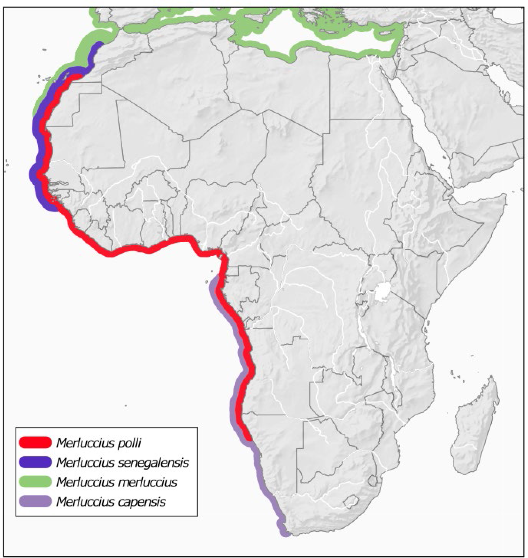 Distribution of Benguela hake M. polli and overlapping species of the genus Merluccius. Species distributions were taken from Pitcher and Alheit (1995). M. polli and M. senegalensis northern limits are updated as reported in Manchih et al. (2018).