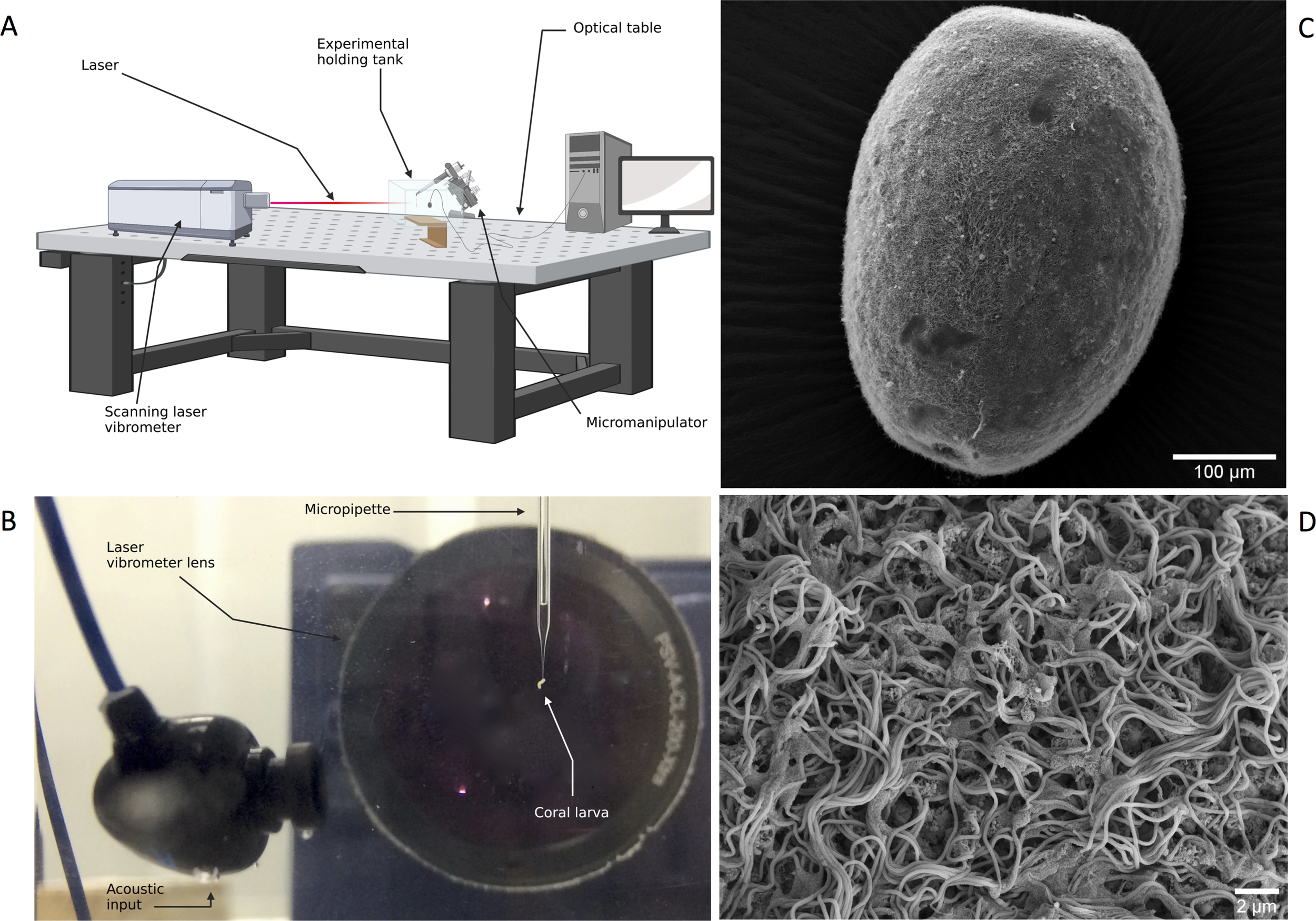 (A) Proposed set-up for coral larvae laser Doppler vibrometry experiment. (B) Close-up of set-up for tethering Acropora millepora larvae in laser Doppler vibrometry experiment (C) Scanning Electron Microscopy (SEM) image of an Acropora millepora planula larva. (D) Magnified larval epiderm highlighting cilia. SEM images: Emelie Brodrick. Laser Doppler Vibrometry schematic (A) created with BioRender.com.