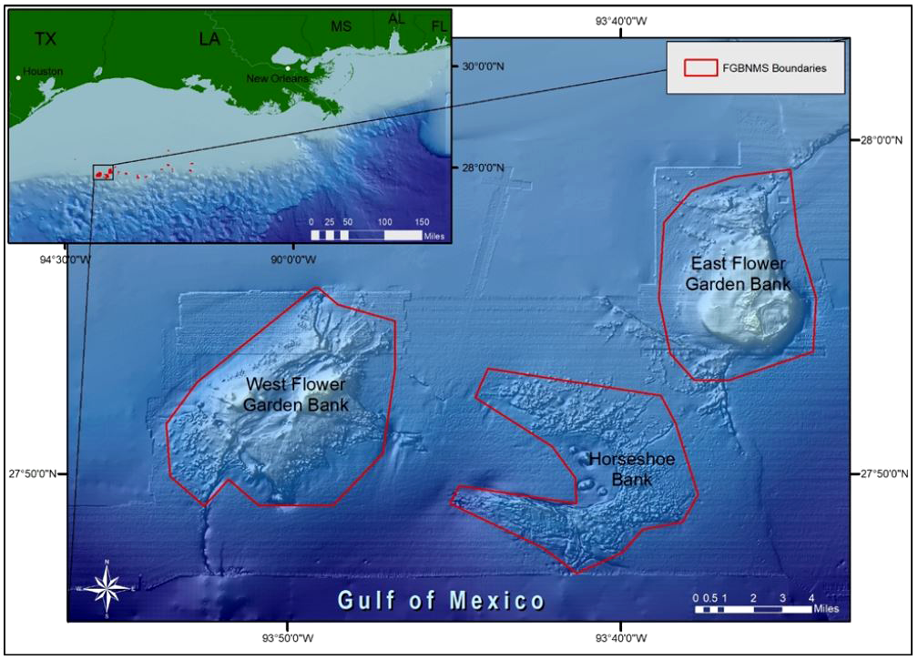 The Flower Garden Banks National Marine Sanctuary (northwest Gulf of Mexico) consists of 17 reefs and banks off the coasts of Texas and Louisiana (inset). East and West FGB boundaries are outlined in red.