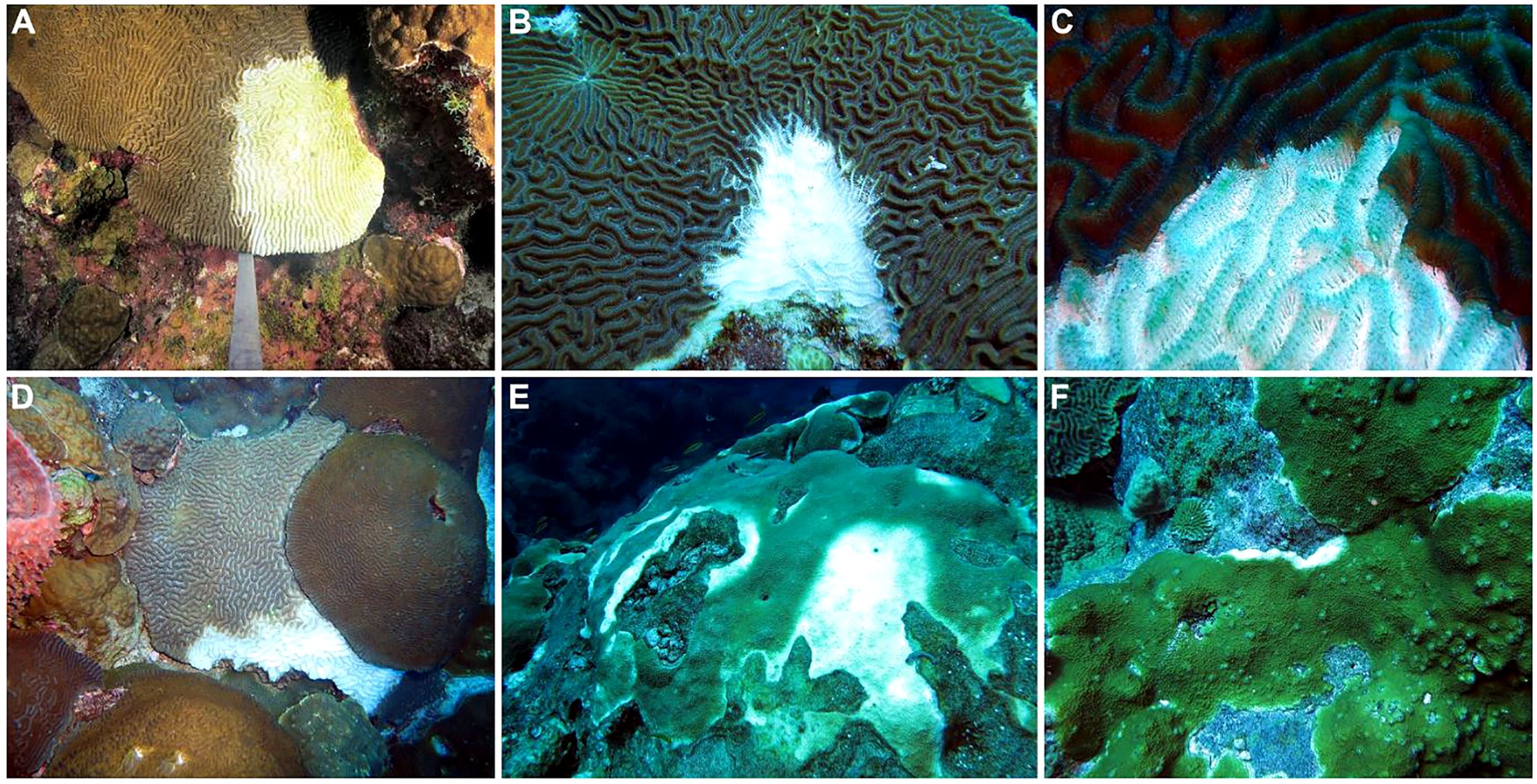 Examples of disease lesions on primary reef-building coral species from Flower Garden Banks (northwest Gulf of Mexico). (A) Focal lesion starting from the margin of a Pseudodiploria strigosa colony, (B) focal lesion on P. strigosa colony with evidence of skeletal damage due to predation (bottom), (C) rapid tissue loss and necrosis at the lesion front on P. strigosa colony, (D) active lesion spreading across Colpophyllia natans colony, (E) multifocal infection on Orbicella faveolata colony, (F) focal lesion beginning on Orbicella franksi colony.