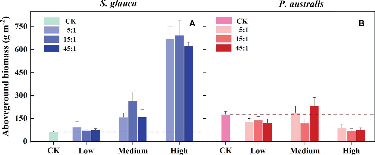 Effects of N and P addition on aboveground biomass of S. glauca(A) and P. australis(B). CK=control. Different bars indicate the mean value (± SE) for each treatment (N and P addition, n=4; CK, n=6).