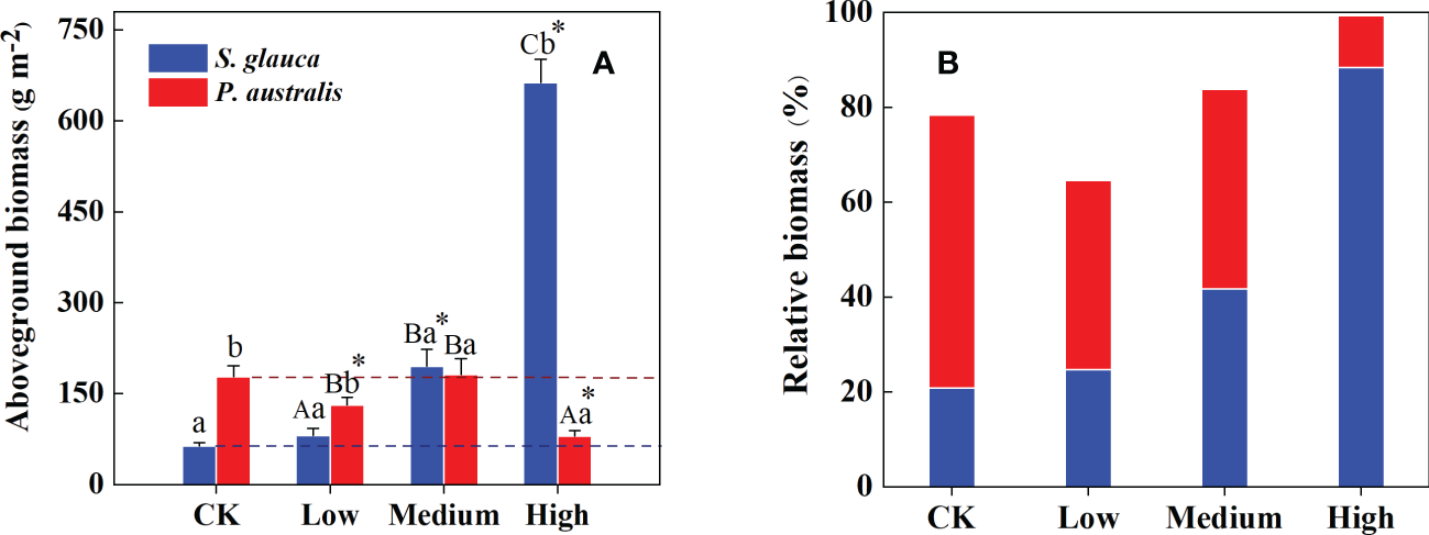 Mean aboveground biomass (A) and relative biomass (B) of S. glauca and P. australis under different treatments. Data show the mean ± SE (supply level treatment, n=12; control treatment, n=6). Different capital letters represent significant differences in plant biomass among the three supply level treatments at the 0.05 level. Different lowercase letters represent significant differences between S. glauca and P. australis under the same treatments at the 0.05 level. * denotes a significant difference between the control treatment and the supply level treatment at the 0.05 level.