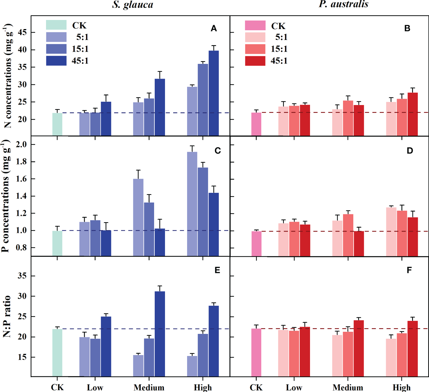 Effects of N and P addition on the N (A, B) and P concentrations (C, D) and the N:P ratio (E, F) of S. glauca and P. australis. Different bars indicate the mean value (± SE) for each treatment (N and P addition, n=4; CK, n=6). Green and red indicate positive and negative relationships corrected to red and green indicate positive and negative relationships.