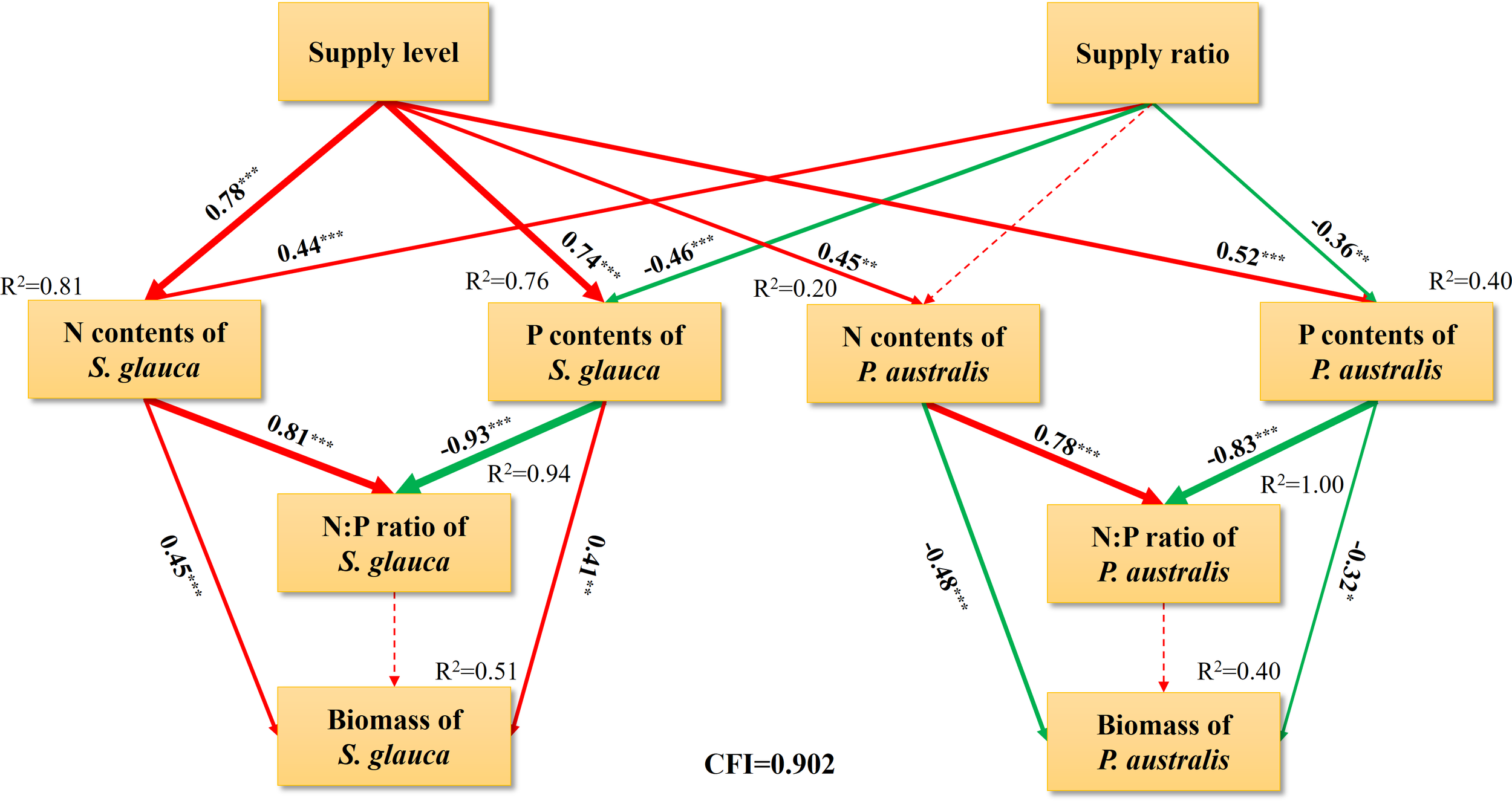 Structural equation model (SEM) considering the underlying causal relationships among leaf N and P contents, N:P ratio and biomass of S. glauca and P. australis under various N and P supplies. CFI, confirmatory fit index. Bold and dashed lines indicate significant (P<0.05) and nonsignificant (P>0.05) pathways, respectively. The width of arrows indicates the strength of the causal effect, while arrows colored red and green indicate positive and negative relationships respectively. The numbers listed within arrows are the standardized path coefficients. The R2 values represent the proportion of the variance explained for each variable. Significance levels are as follows: *P < 0.05, **P < 0.01, and ***P < 0.001.