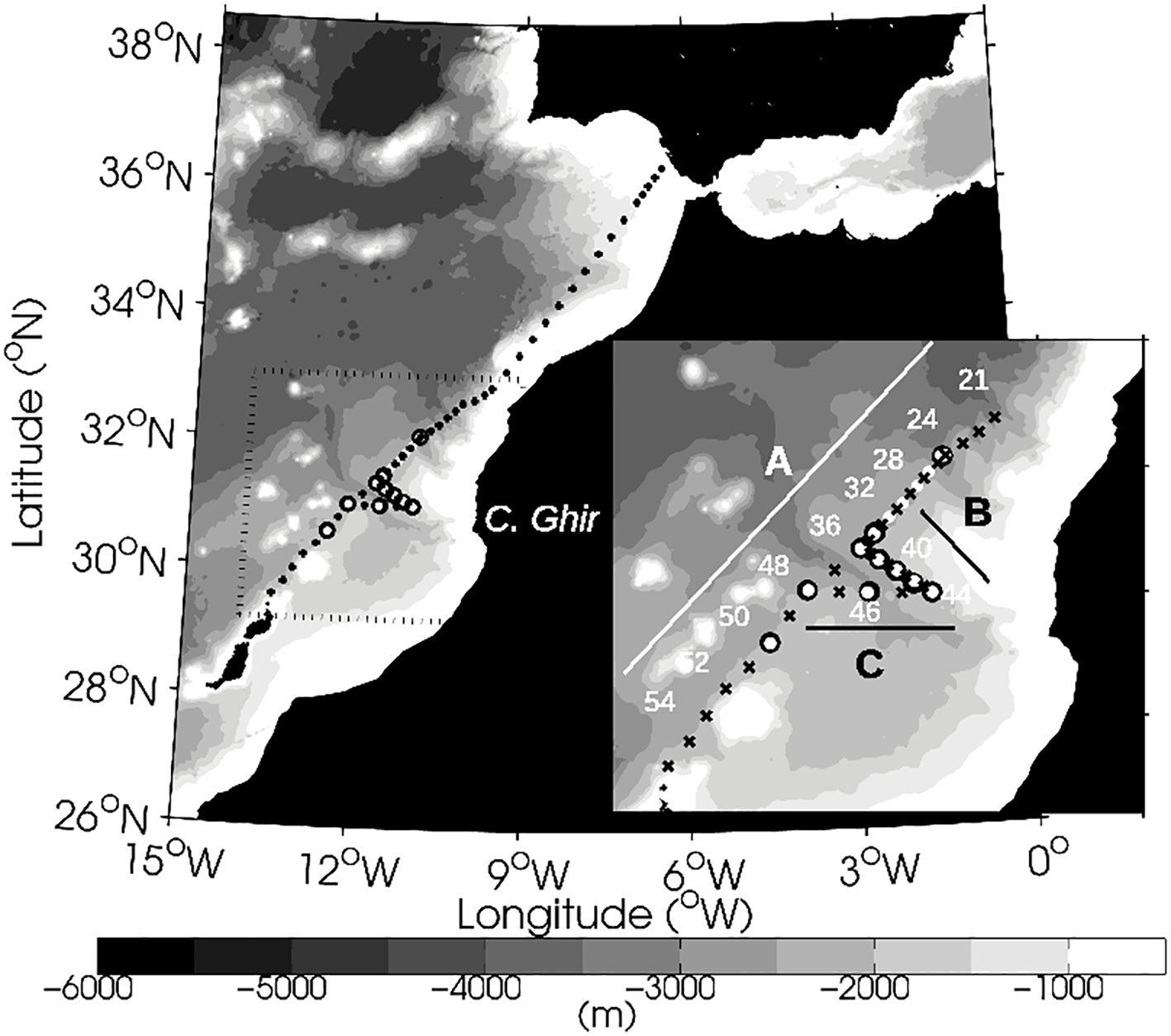 The hydrographic data used in this study were obtained from a survey of the Cape Ghir region in northwestern Africa, which formed part of the project “Mixing Processes in the Canary Basin (PROMECA)” (Figure 1). The survey was conducted aboard the R/V García del Cid in early fall (18–29 October 2010) when the Trade Winds typically weaken. Conductivity-temperature-depth (CTD), expendable bathythermograph (XBT), and microstructure data were collected at stations located approximately 10 km apart from one another along three transects (A, B, and C in Figure 1).