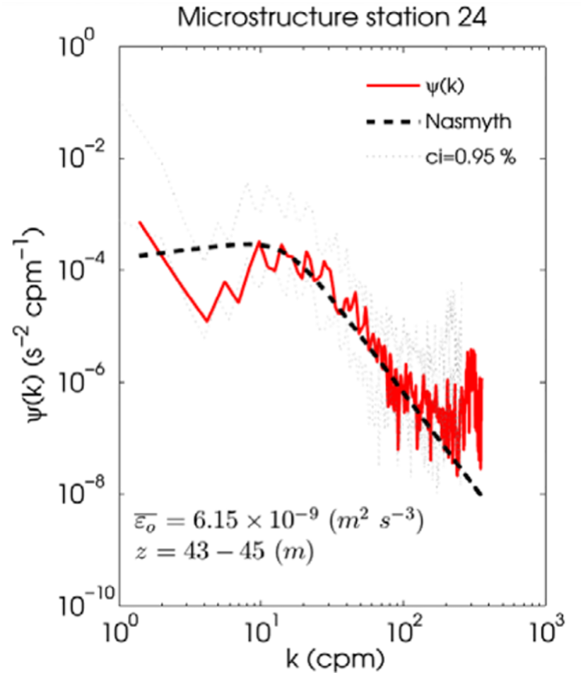 Figure 3 Shear power spectral density, ψ(k) (red solid line), for station 24 from the PROMECA-cruise for a depth range (z) of 43 to 45 m. The Nasmyth universal spectra is shown as a dashed black line. The turbulent kinetic energy (TKE) dissipation rate, , is averaged over the z range. The dotted thin lines indicate the 0.95% confidence interval for the power spectral density calculation. At the bottom, k represents the wavenumber in cycles per minute (cpm).