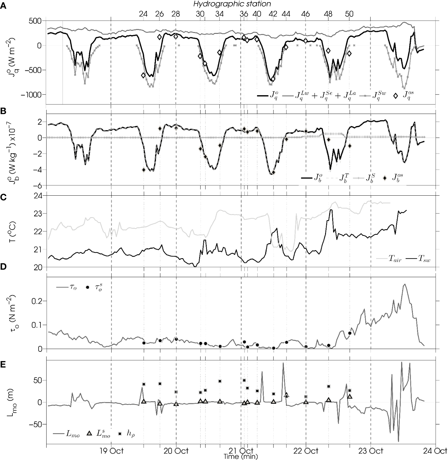 Half-hourly averaged meteorological data. (A) The net surface heat flux (, W m-2, defined positive upward) and the related components of the shortwave radiation flux (), net longwave heat flux (), latent heat flux (), and sensible heat flux (). (B) The net surface buoyancy flux (, W kg-1), defined as the sum of the thermal surface buoyancy flux () and haline surface buoyancy flux (). (C) Sea water temperature (Tsw) and air temperature (Tair, °C). (D) Wind stress (τo, N m-2). (E) Monin-Obukhov length scale (Lmo, m) and mixed layer depth (hρ, m). Symbols superimposed on the time series denoted with a superscript s represent the exact values of each meteorological quantity obtained with the CTD casts from each hydrographic station. The thin vertical dashed lines at the top of the figure indicate the hydrographic stations. The thick dashed lines at the bottom of the figure indicate the end of each day.