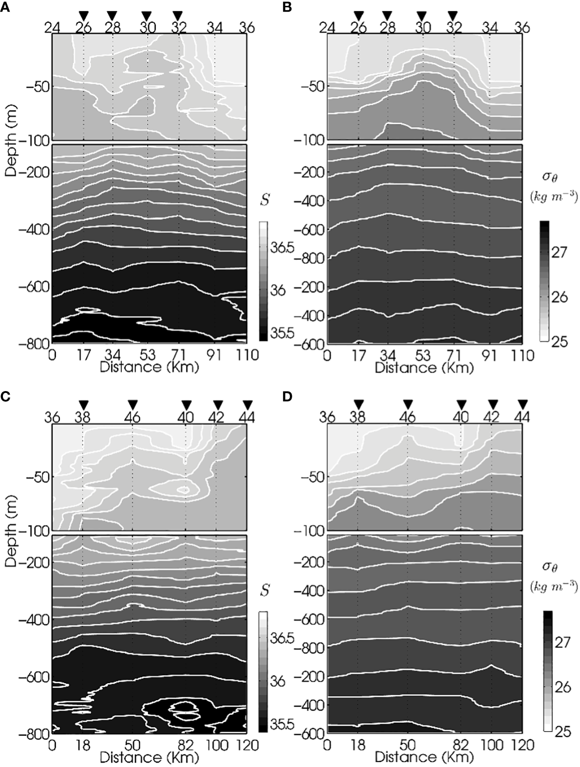 Vertical hydrographic sections derived from CTD profiles of (A) absolute salinity (S) and (B) potential density anomaly (σθ, m kg-3) for transect A and (C)S and (D)σθ for transect B. Contours of S are plotted at 0.5 intervals, while σθ contours are plotted every 0.1 kg m-3. The cumulative distance between stations in km is shown at the bottom of each panel. The hydrographic station numbers are shown at the top of each panel. Inverted triangles indicate stations influenced by the upwelling filament.