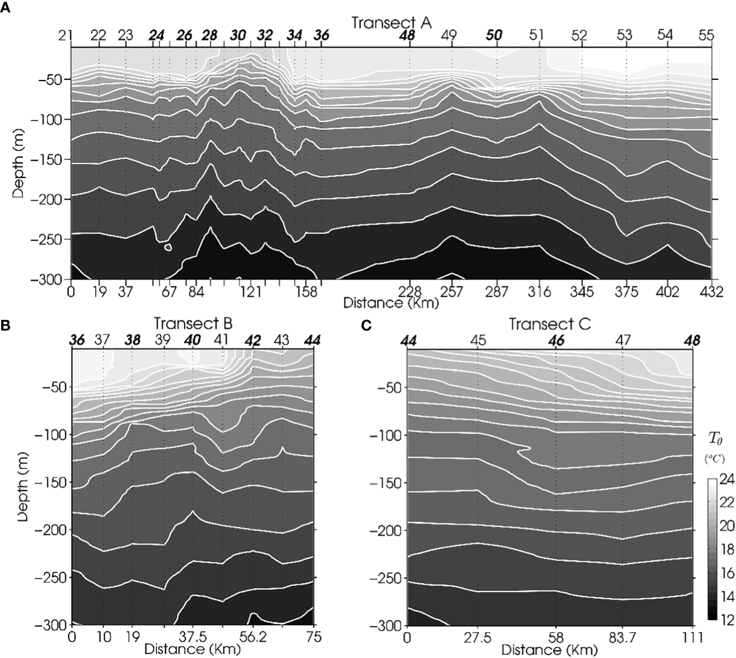 An abrupt upwelling of isohalines and isopycnals (Figures 5C, D) and isotherms (Figure 6B) from station 44 to 48 was apparent in transect B, which was located mostly onshore. The combined CTD-XBT vertical section allowed for the creation of an additional transect, C (Figure 6C), in which isotherm outcropping was smoother than that of transect B. This may have been due to the proximity of transect B to the filament.