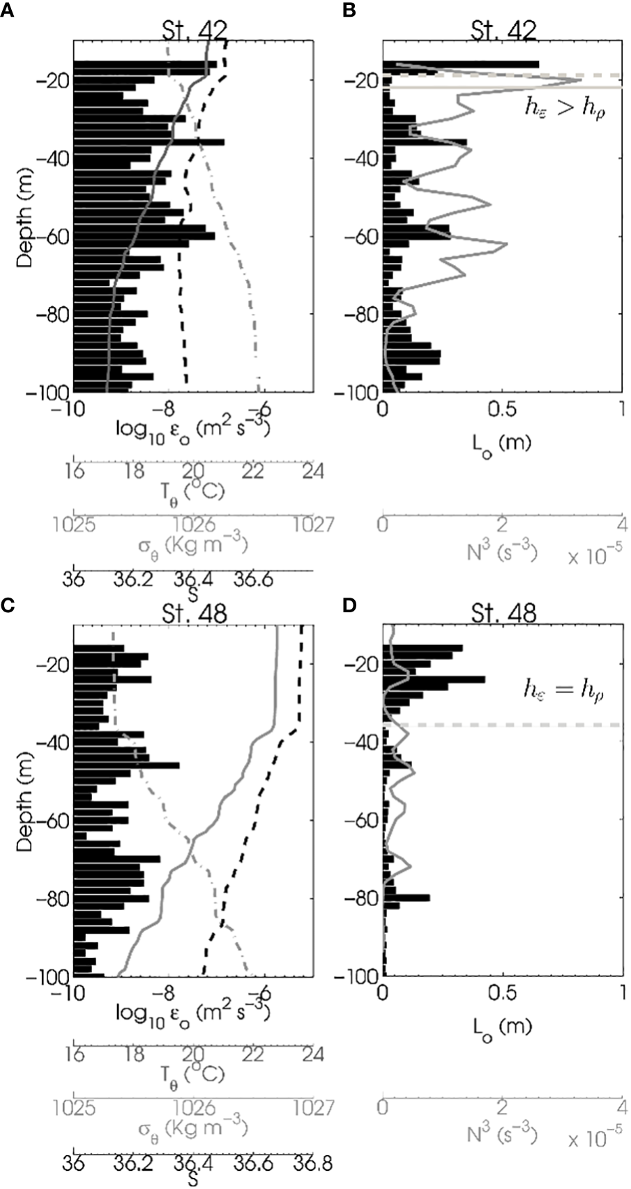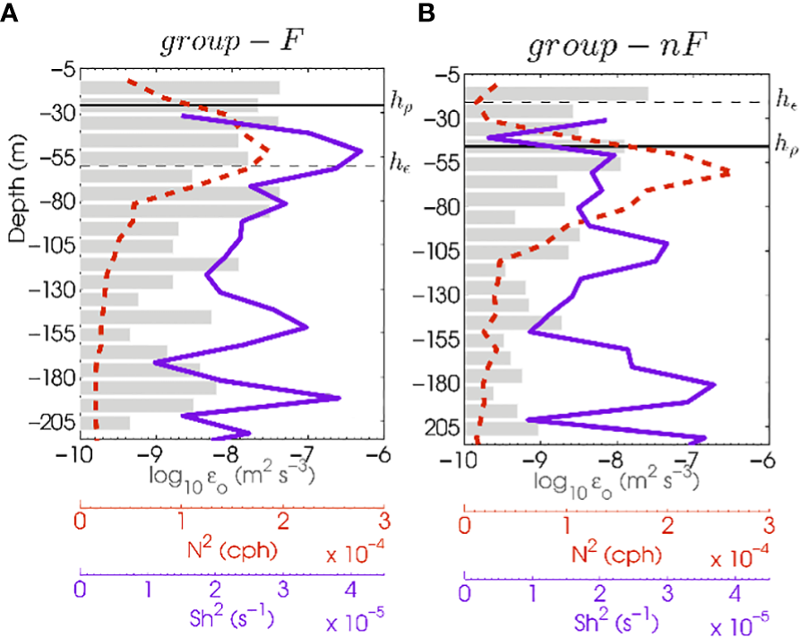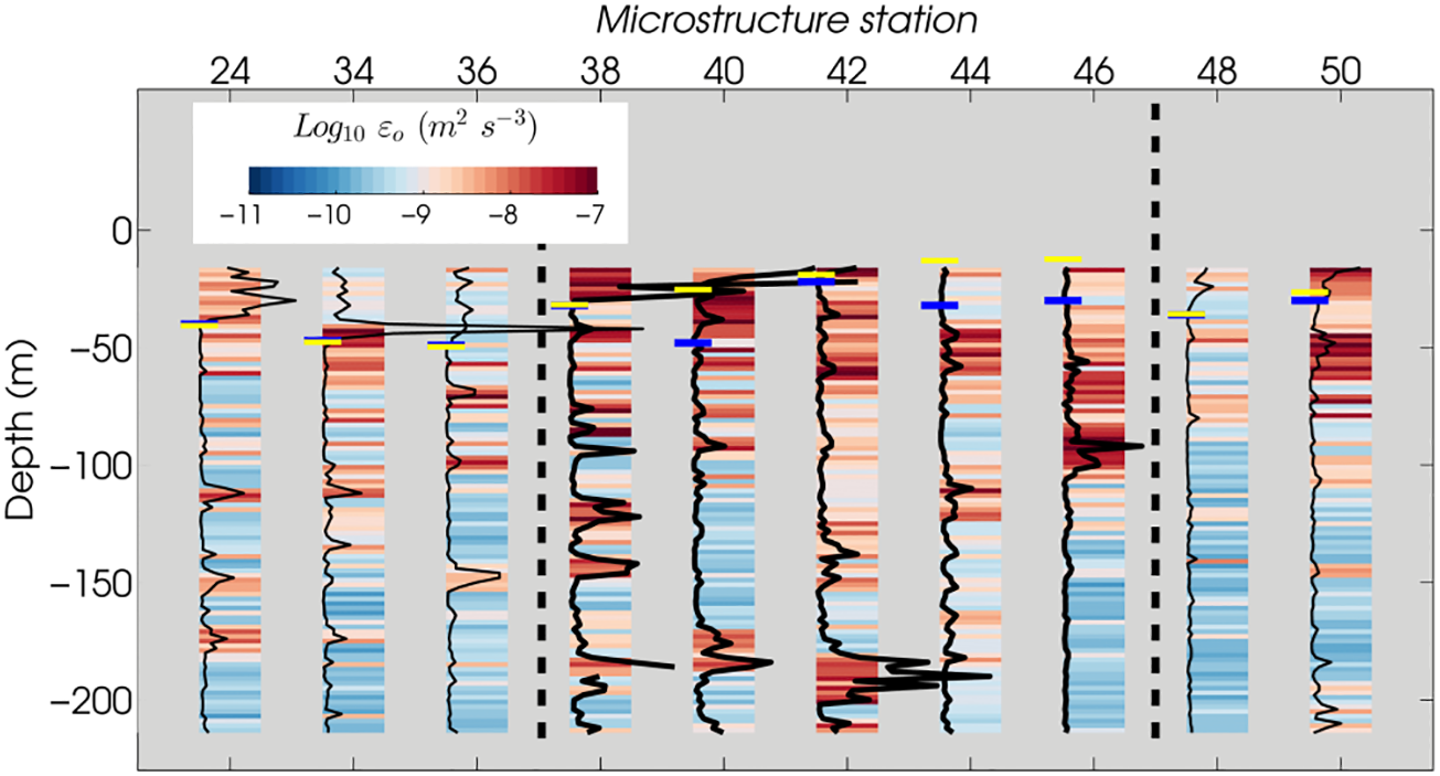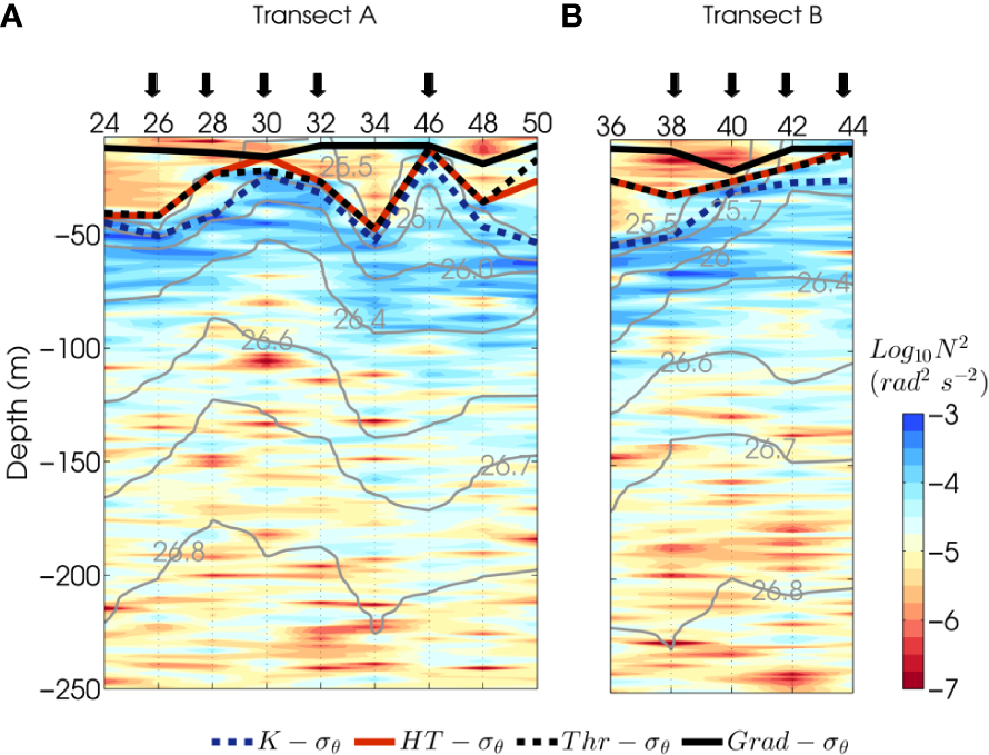 In this study, we refer to the upper boundary layer as the region comprising both the mixed layer depth () and mixing layer depth (). The latter is the depth at which active mixing processes operate (Brainerd and Gregg, 1995). Some studies have indicated that may play an important role in highly dynamic areas like frontal systems. This is relevant because the vertical transport of heat, momentum, and hydrophysical material within the upper boundary layer is controlled by turbulent mixing (Brainerd and Gregg, 1995; Cisewski et al., 2008; Inoue et al., 2010; Sutherland et al., 2014), with important and consequences for phytoplankton blooms (Franks, 2014).