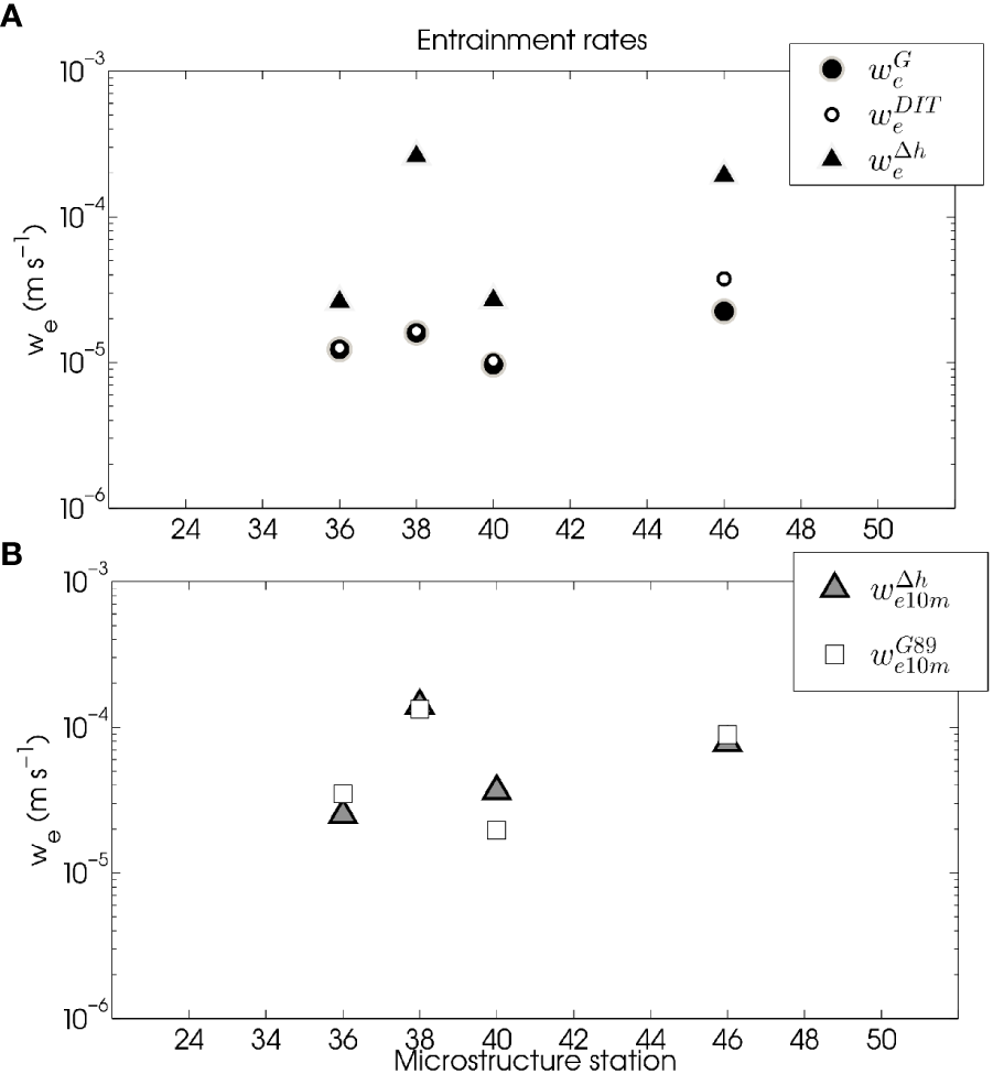 where the mixing efficiency (Г) is the ratio of the vertical buoyancy flux to . We employed a constant value of 0.2 (e.g., Zaron and Moum, 2009). To consider the diapycnal turbulent buoyancy flux that contributes to the TKE budget in the entrainment zone, a parameterization derived from Osborn (1980) was integrated over the entrainment zone, (i.e., from to ) to obtain :