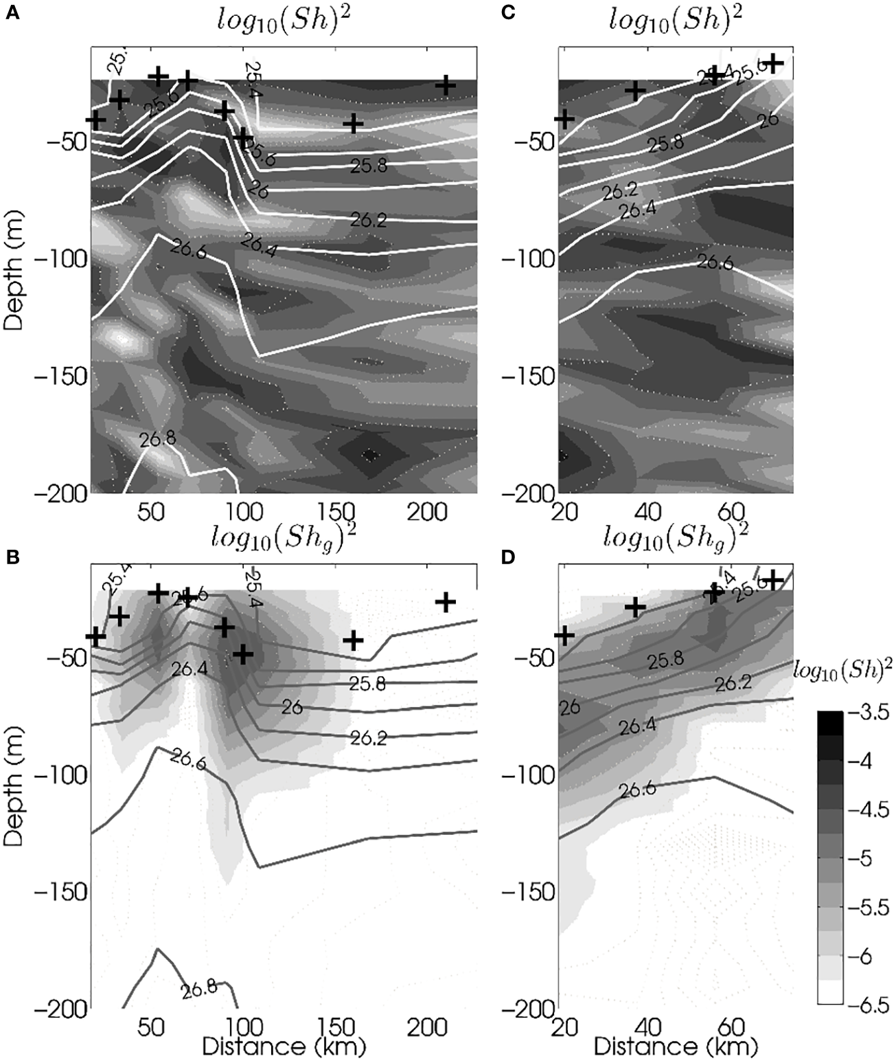 Figure 11 (A) Vertical sections of total vertical shear squared (Sh2, s-2) for transect A rotated to the reference system of geostrophic velocities and (B) geostrophic vertical shear squared (, s-2) with the level of no motion set to 650 m for transect (A) The same is shown in (C, D) for transect (B) Crosses represent the mixed layer depths (hρ, m) averaged between pairs of stations. Note the logarithmic scale. The isopycnals (kg m-3) are also shown. The cumulative distance (km) between stations is shown at the bottom.
