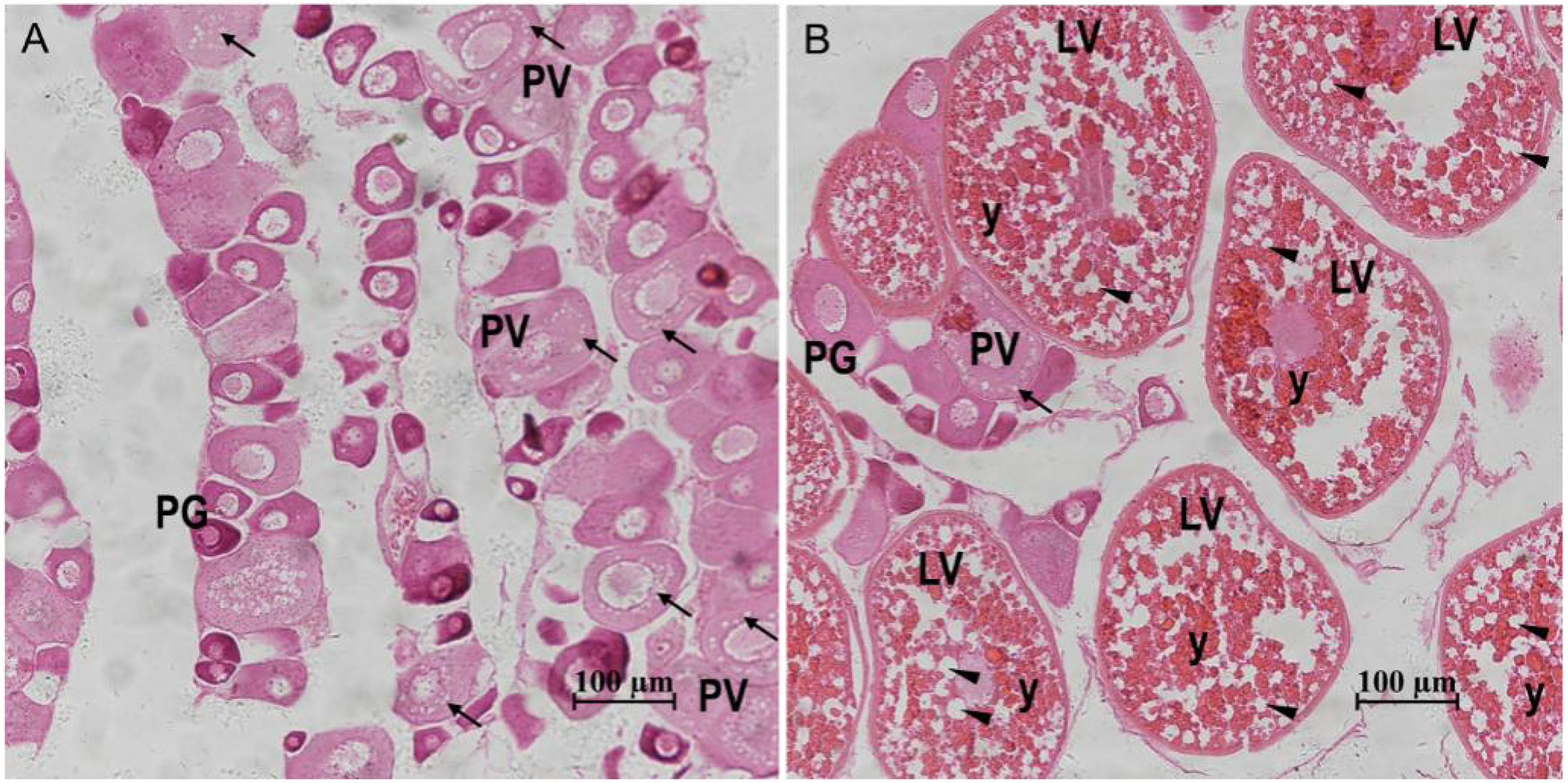 Gonadal histology of the S. argus. (A) Stage III. (B) Stage IV. “↑”: cortical alveoli; “▲”: lipid droplets; “y”: yolk granules; PG: primary growth stage oocyte; PV: previtellogenic stage follicle; LV: late vitellogenic stage follicle; Scale bar: 100 micrometre.