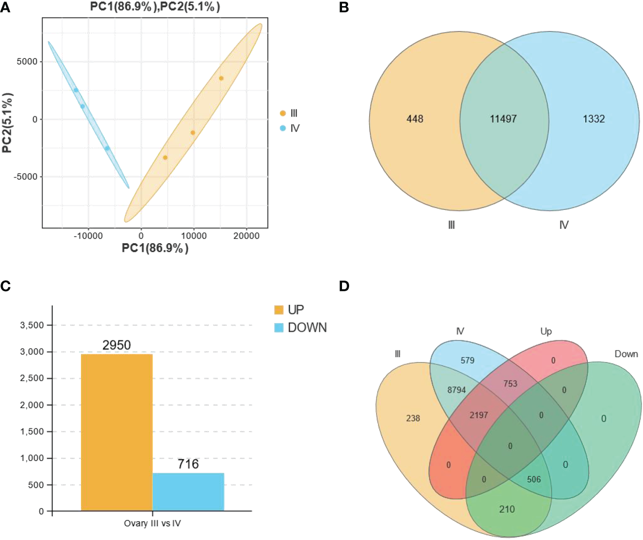 All the expressed and the differentially expressed genes (DEGs) obtained from the RNA-seq data of stage III and IV ovaries of S. argus. (A) Principal component analysis (PCA) showing the differences between biological groups. (B) A Venn diagram depicting the total number of genes expressed in stage III (11945) and stage IV (12829) ovary of S. argus. (C) Differentially expressed genes (DEGs) in stage III and IV ovary of S. argus. (D) A Venn diagram depicting the distribution of DEGs in the different classes, including groups for expressed genes in stage III and stage IV ovaries and up- and down-regulated gene groups.