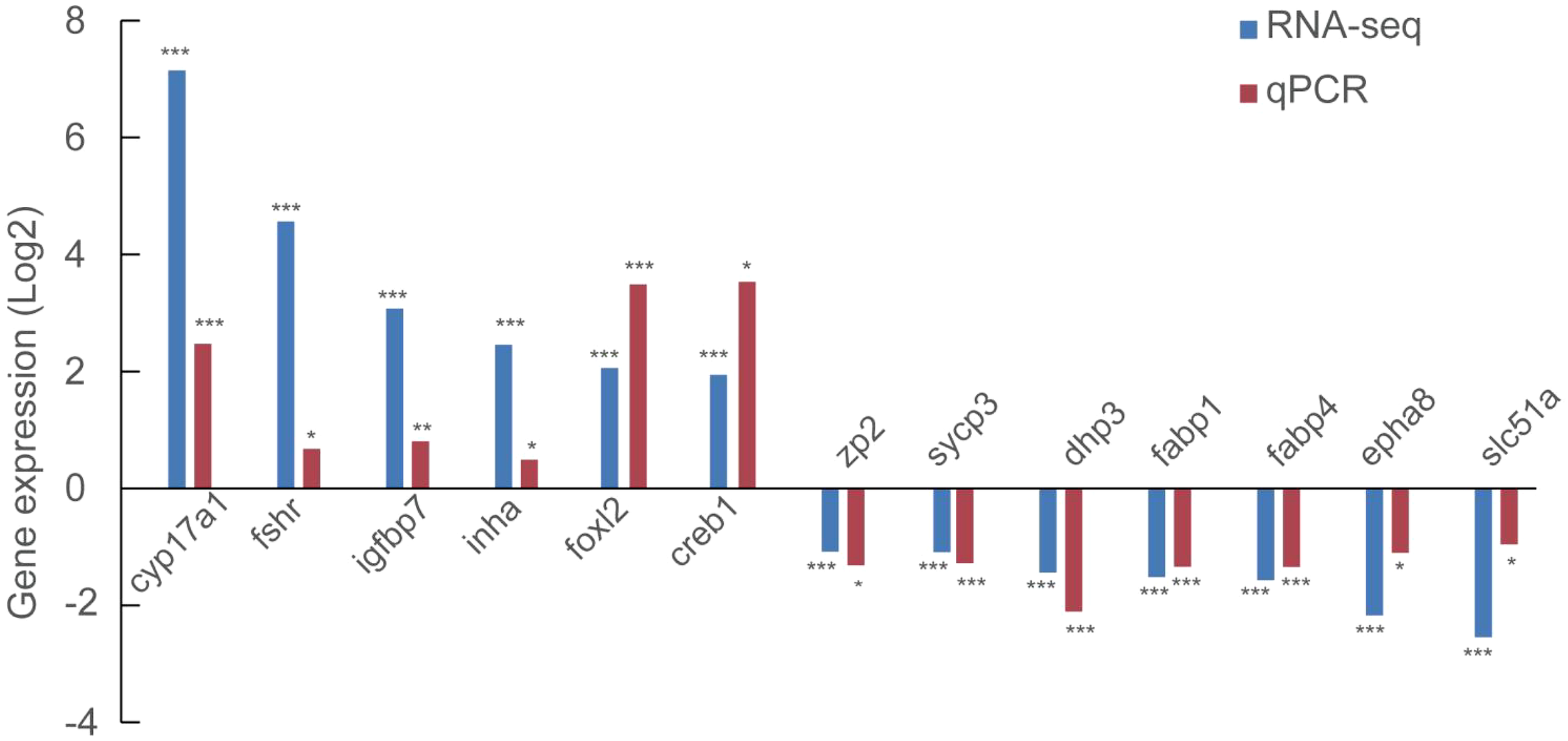 We further evaluated 6 up-regulated genes (cyp17a1, fshr, igfbp7, inha, foxl2, and creb1) and 7 down-regulated genes (zp2, sycp3, dhp3, fabp1, fabp4, epha8 and slc51a) using qRT-PCR to validate the RNA-seq results. Notably, all the genes assayed exhibited a significant difference (P<0.05) in their expression between stage III and stage IV, fully agreeing with the RNA-seq result (Figure 3).