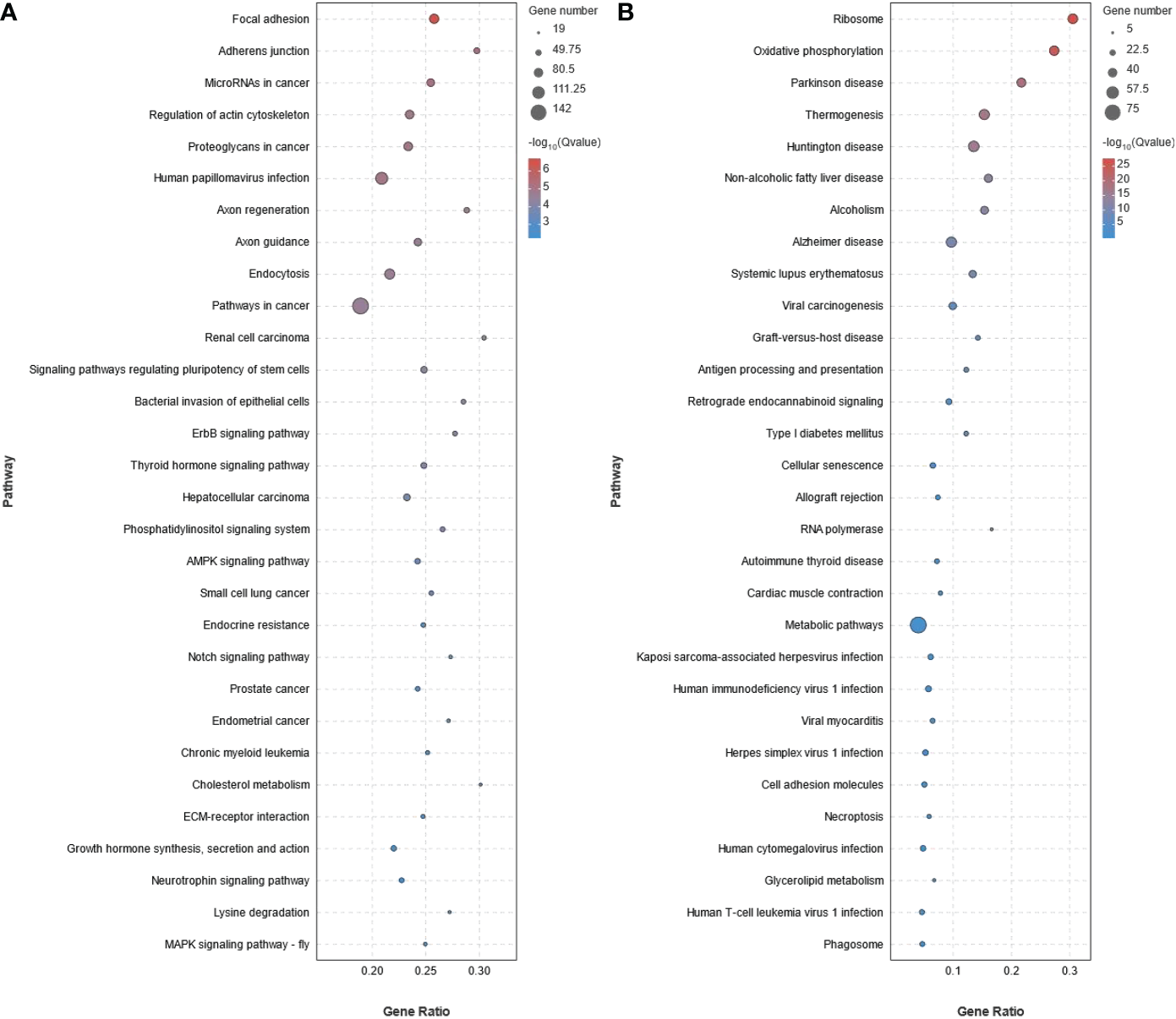 KEGG pathway enrichment analysis showed that 93 pathways were significantly enriched (P < 0.05) in the up-regulated DEGs (Figure 5A and Supplementary Table S6). The 93 pathways could be divided into six categories: cellular process (eg. Focal adhesion, Adherens junction, Endocytosis, Tight junction, and Cell cycle), environmental information processing (eg. AMPK signaling pathway, Notch signaling pathway, ECM-receptor interaction, MAPK signaling pathway - fly, MAPK signaling pathway, TGF-beta signaling pathway, Hippo signaling pathway, JAK-STAT signaling pathway, Wnt signaling pathway, and FoxO signaling pathway), genetic information processing (eg. Ubiquitin mediated proteolysis, Nucleocytoplasmic transport, and Fanconi anemia pathway), metabolism (eg. Lysine degradation, Glycosaminoglycan biosynthesis - heparan sulfate/heparin, Inositol phosphate metabolism, and Glycerophospholipid metabolism), organismal systems (eg. Axon guidance, Thyroid hormone signaling pathway, Cholesterol metabolism, Insulin signaling pathway, and PPAR signaling pathway), and human diseases (eg. MicroRNAs in cancer, Proteoglycans in cancer, and Pathways in cancer). Similarly, 28 pathways were found to be significantly enriched (P < 0.05) in the down-regulated DEGs and could also be divided into the same six categories (Figure 5B and Supplementary Table S7).