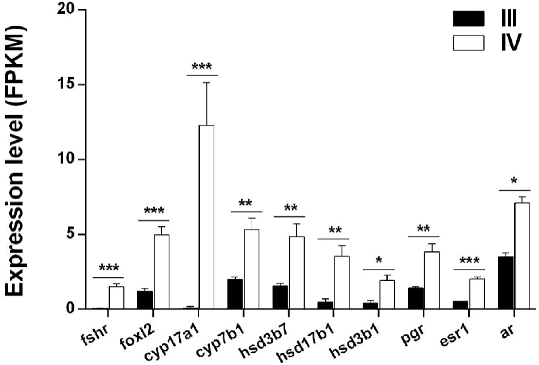 Histogram showing the expression of DEGs (log2 (FC) >1 and FDR <0.05) involved in steroid hormone synthesis in stage III and IV ovarian growth and development of S. argus. The data is based on the FPKM values obtained from the RNA-seq data. *, P<0.05; **, P<0.01; ***, P<0.001.