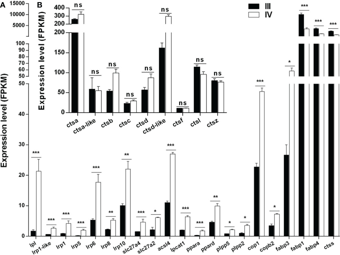 Histogram showing the expression of genes associated with lipid droplet and yolk production. (A) Expression of DEGs (log2 (FC) >1 and FDR <0.05) involved in lipid droplet and yolk production in stage III and IV ovary of S. argus. (B) Expression of genes (log2 (FC) ≤1 or FDR > 0.05) involved in vitellogenin catalysis. The data is based on the FPKM values obtained from the RNA-seq data. *, P<0.05; **, P<0.01; ***, P<0.001; ns, No significant difference.